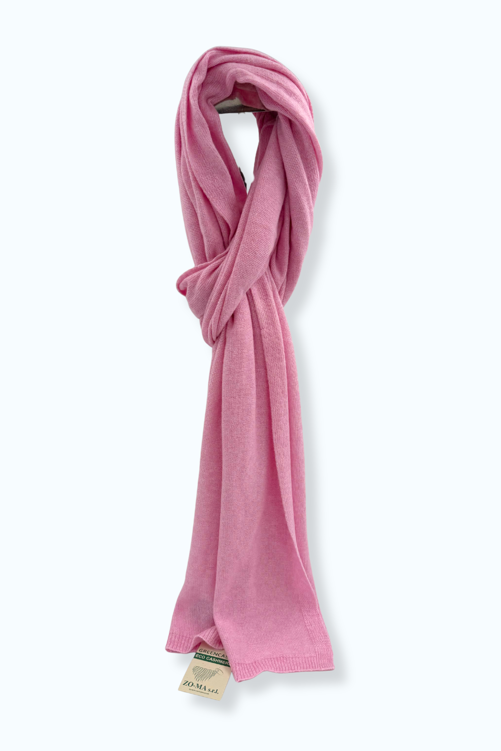 Roze sjaal gemaakt van een milieuvriendelijk garen, geproduceerd in Italië door ZO-MA van volledig gerecycled kasjmier, extra fijne wol en polyamide, evenals birla-viscose, een vezel geproduceerd uit birla-cellulose met houtpulp afkomstig van gecertificeerde duurzame boomteelt. Te verkrijgen in diverse andere kleuren.