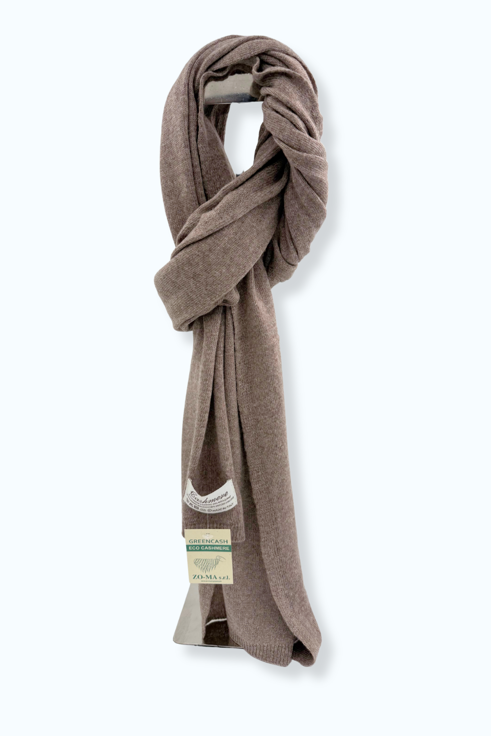 Taupe sjaal gemaakt van een milieuvriendelijk garen, geproduceerd in Italië door ZO-MA van volledig gerecycled kasjmier, extra fijne wol en polyamide, evenals birla-viscose, een vezel geproduceerd uit birla-cellulose met houtpulp afkomstig van gecertificeerde duurzame boomteelt. Te verkrijgen in diverse andere kleuren.