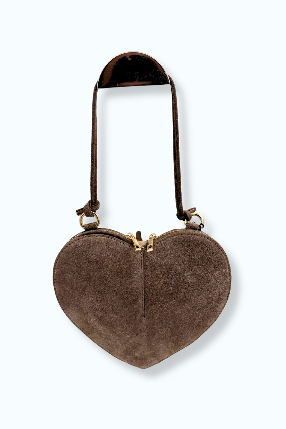 Taupe schoudertasje in de vorm van een hart. Gemaakt van echt rundleer in Italië met gouden details en een buitenkant van suede. Bevat een lange strap, zodat de tas ook gemakkelijk over de schouder te dragen is. Ook in het bordeaux rood te verkrijgen.
