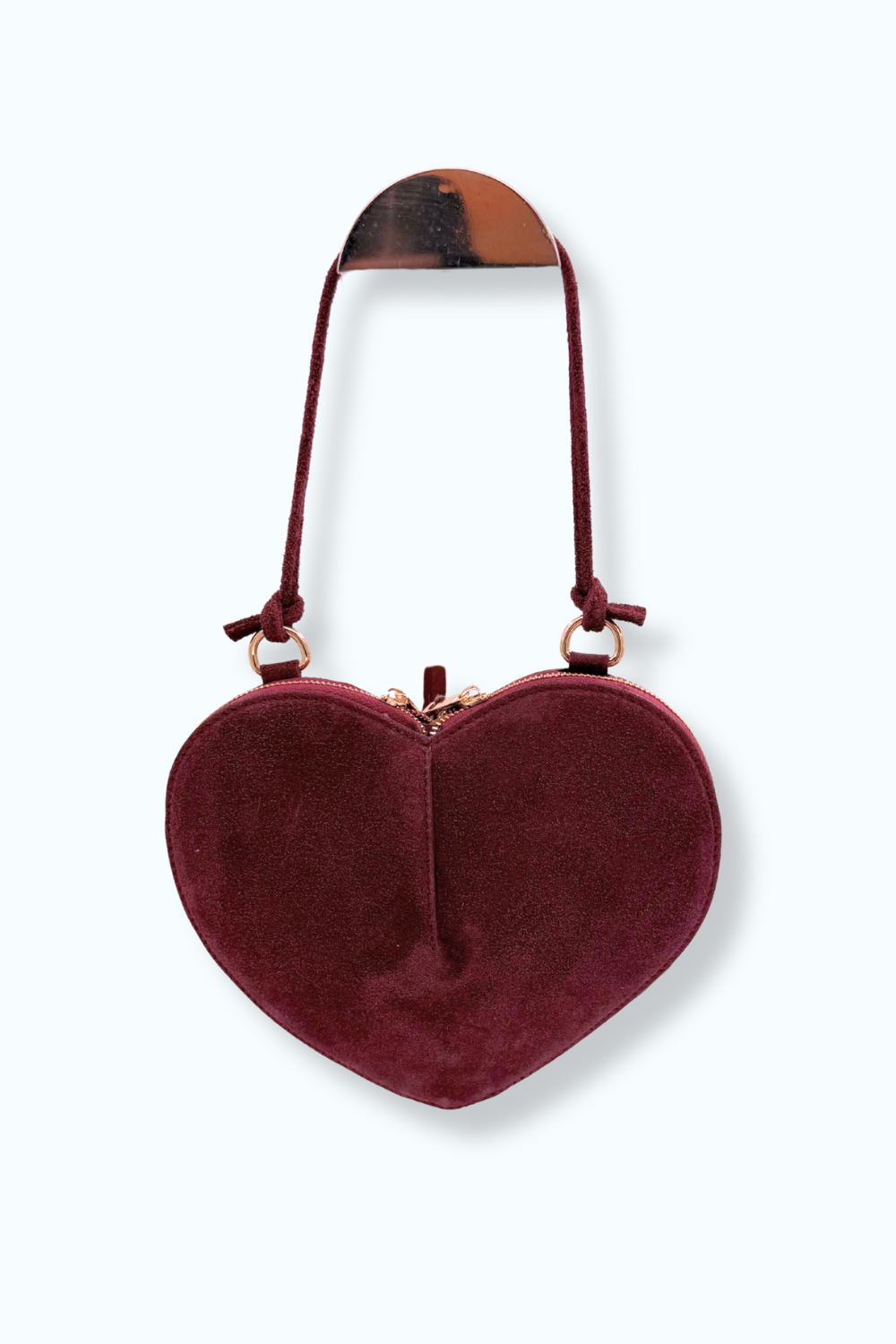 Bordeaux rood schoudertasje in de vorm van een hart. Gemaakt van echt rundleer in Italië met gouden details en een buitenkant van suede. Bevat een lange strap, zodat de tas ook gemakkelijk over de schouder te dragen is. Ook in de kleur taupe te verkrijgen.