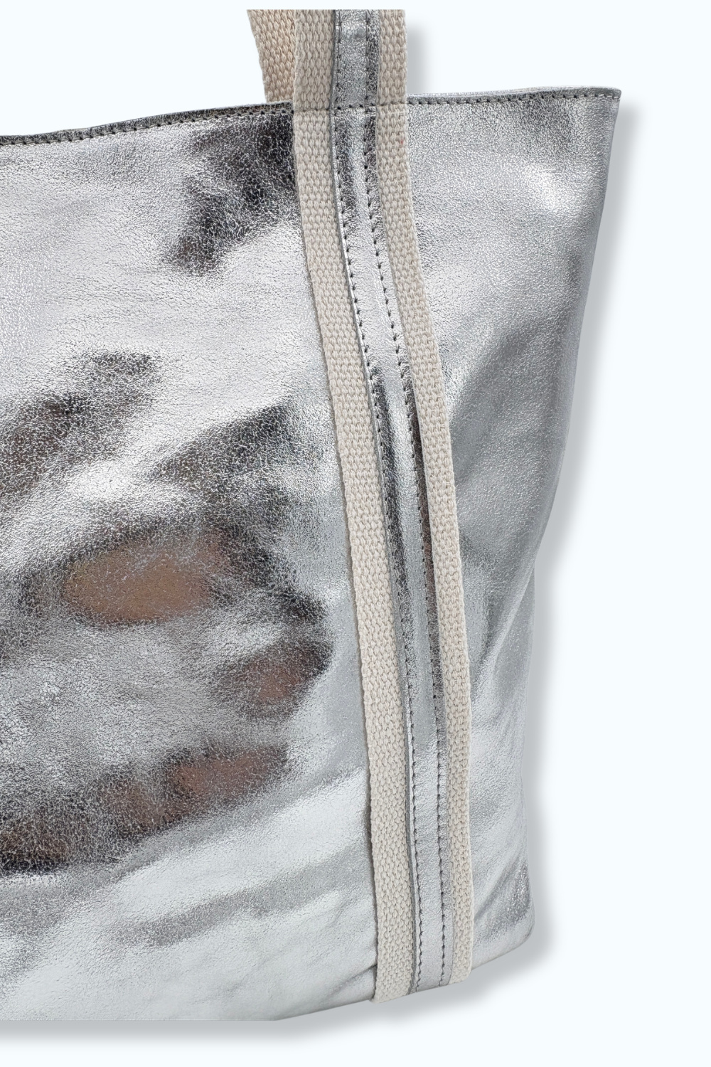 Zilveren tas van echt leer, gemaakt in Italië. Bevat een extra opbergvak met rits binnenin.