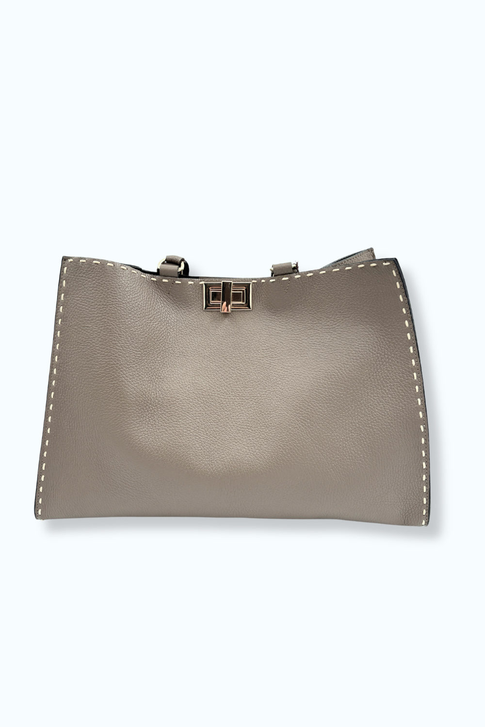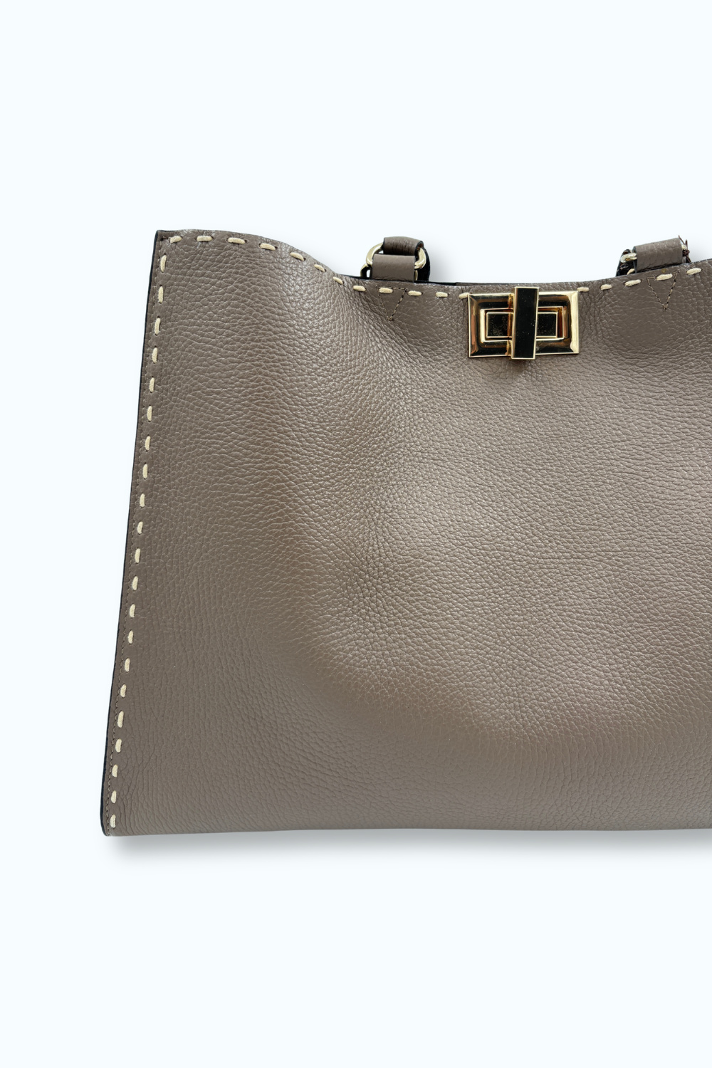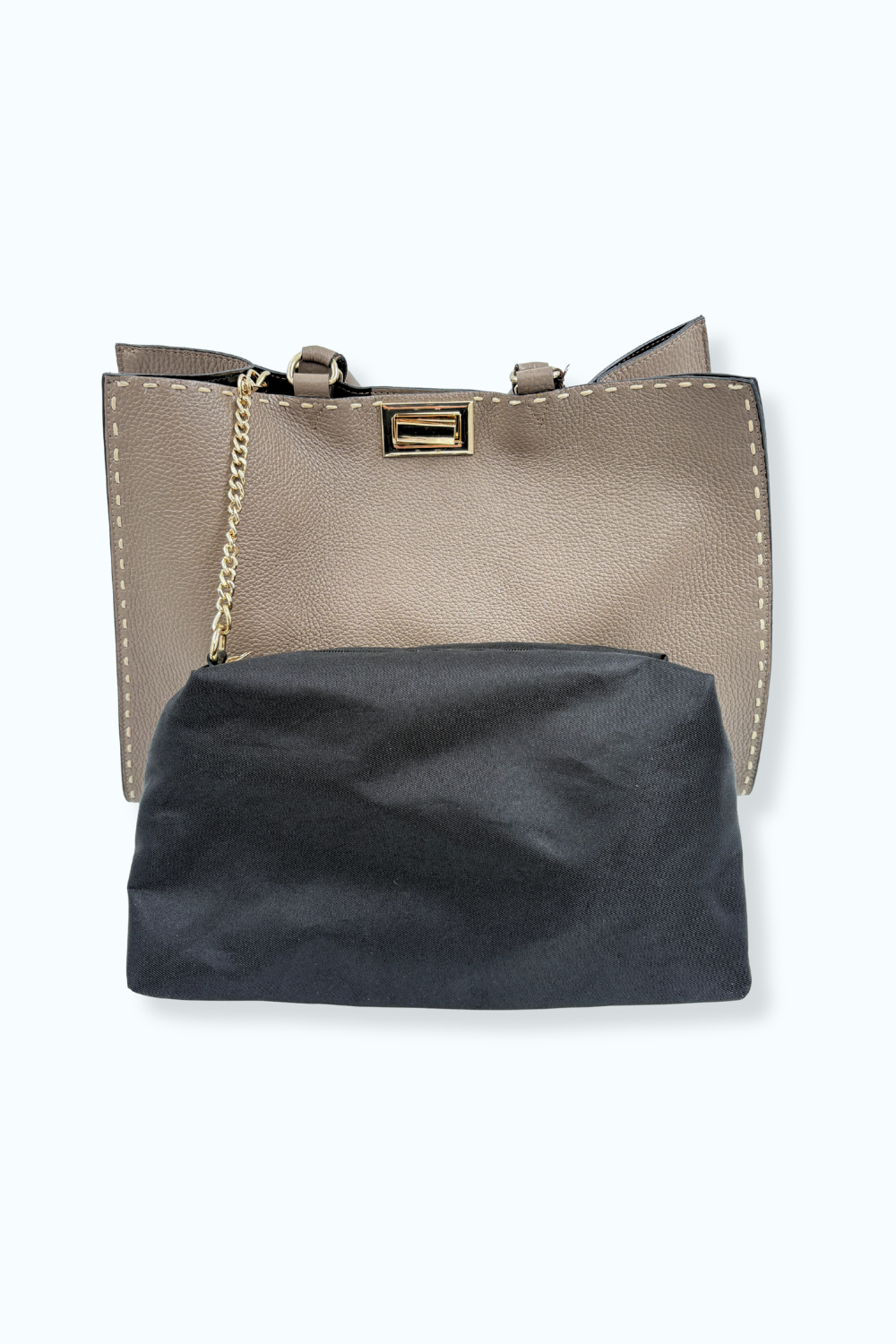 Taupekleurige tas van echt leer, gemaakt in Italië, met gouden details. Bevat draaisluiting, een extra loszittend tasje aan de binnenkant en een lange strap, zodat de tas ook gemakkelijk over de schouder te dragen is.