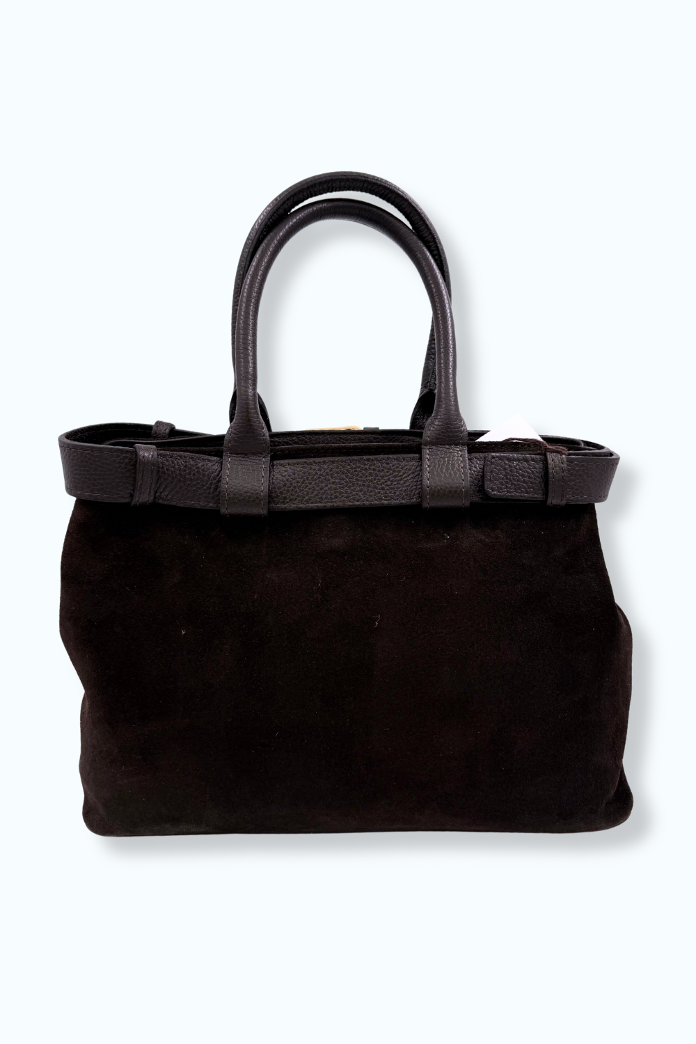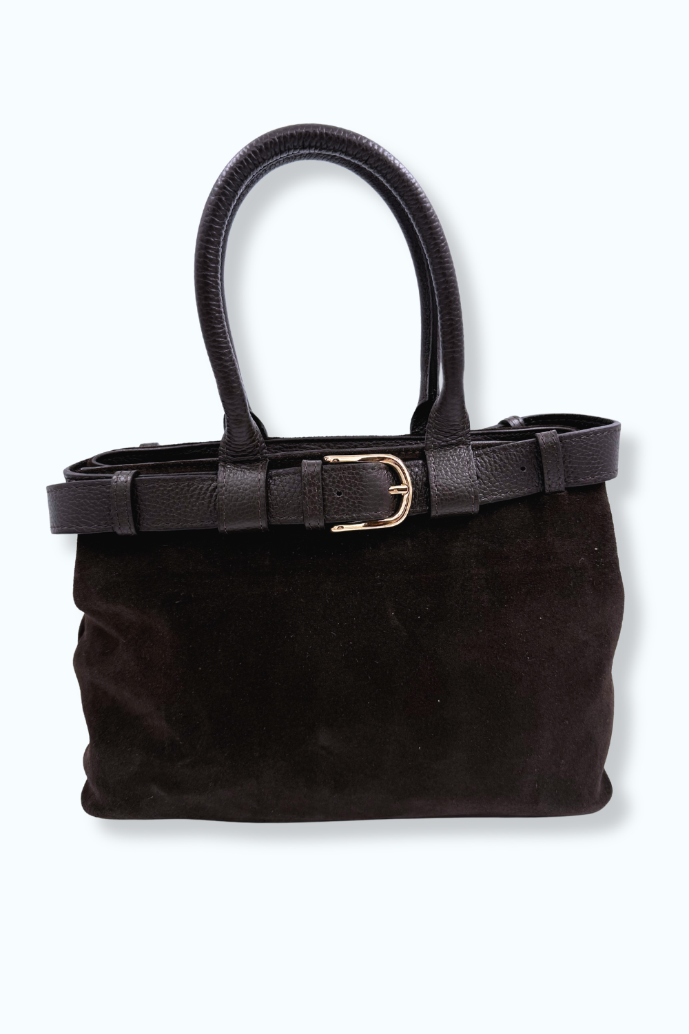 Zwarte tas van echt leer gemaakt in Italië met gouden details, een decoratieve riem om de rand, en een buitenkant van suede. Bevat meerder opbergvakken binnenin, waarvan één met rits, en een lange strap, zodat de tas ook gemakkelijk over de schouder te dragen is.