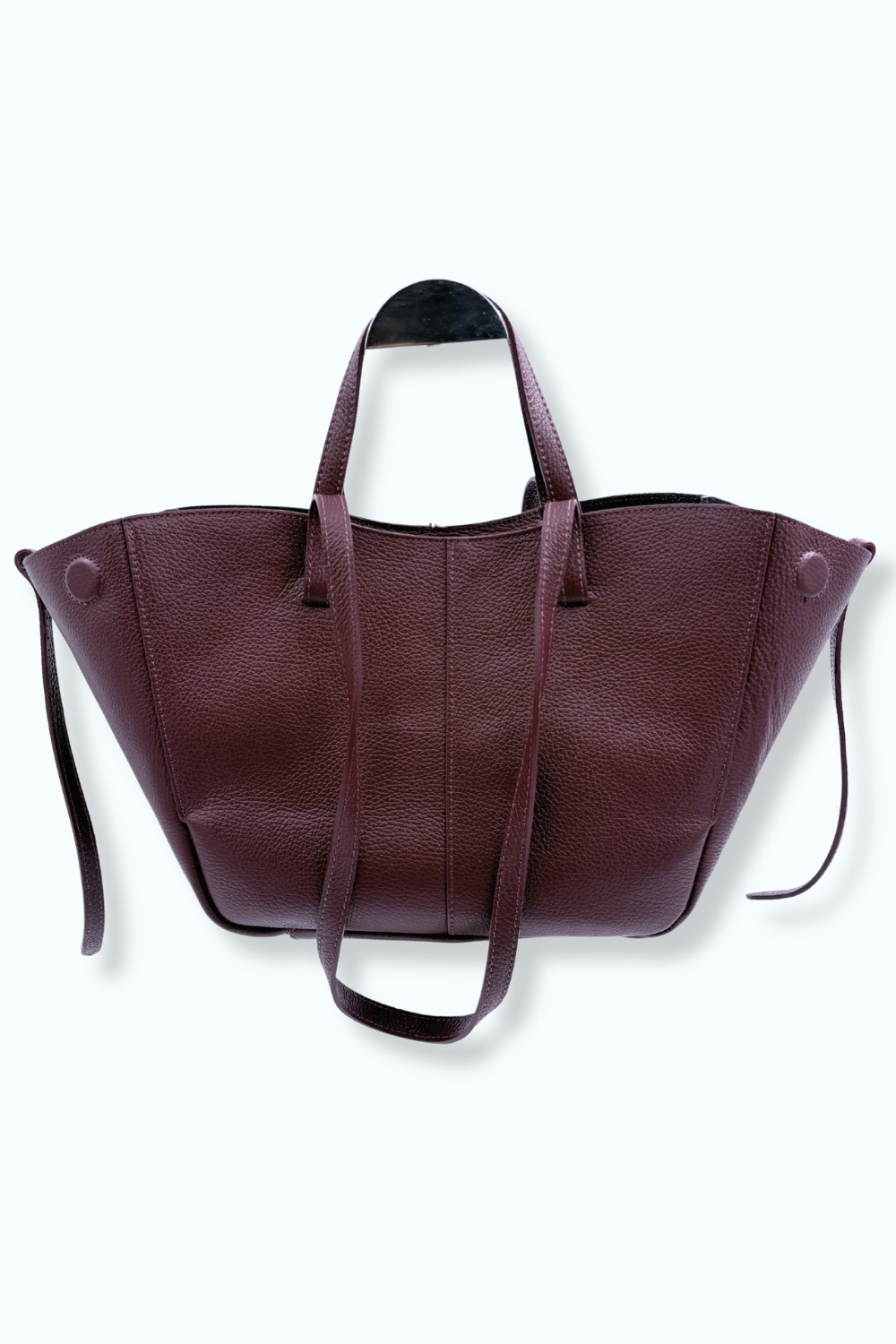 Bordeaux rode tas van echt leer met gouden details. Gemaakt in Italië. Bevat extra loszittende tas aan binnenkant en twee paar hengsels in verschillende lengtes. Ook in het roze te verkrijgen.