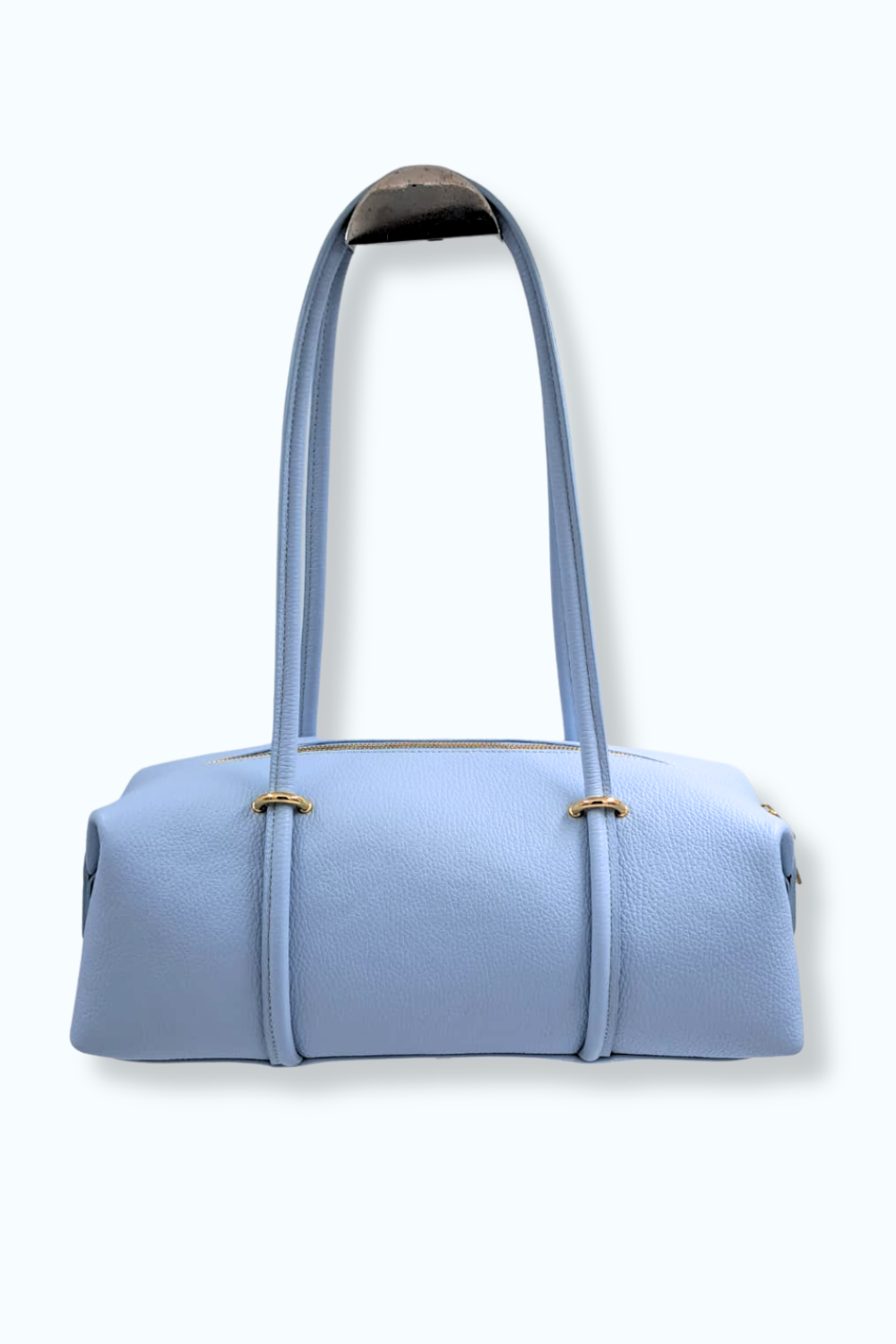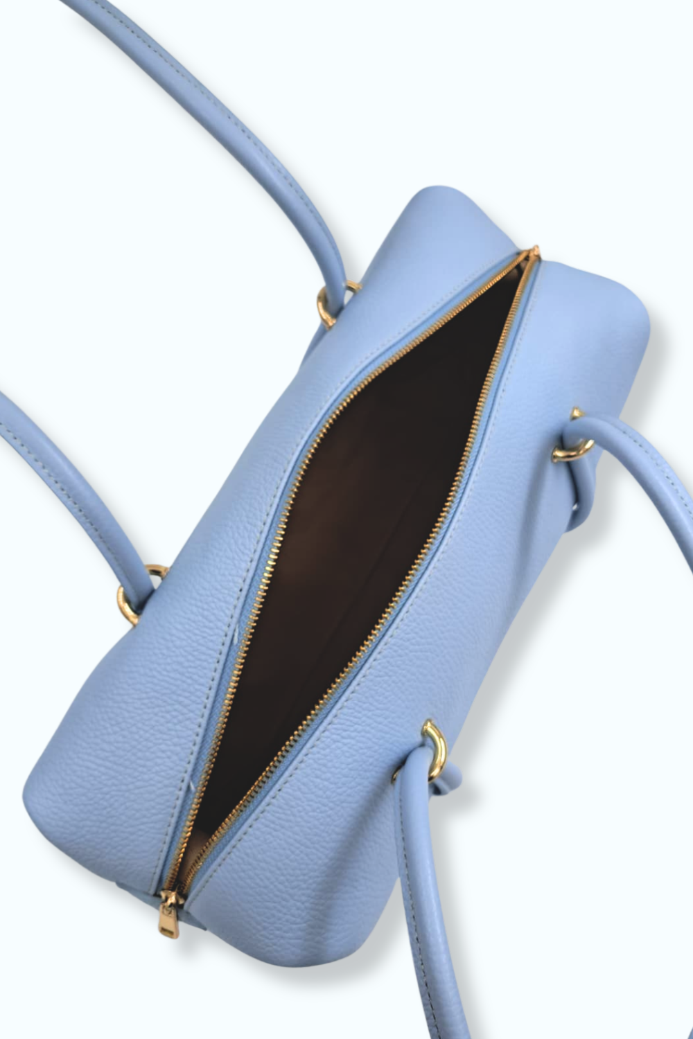 Lichtblauwe tas van genuine leather met gouden details. Gemaakt in Italië. L: 40cm D: 15cm H: 12cm
