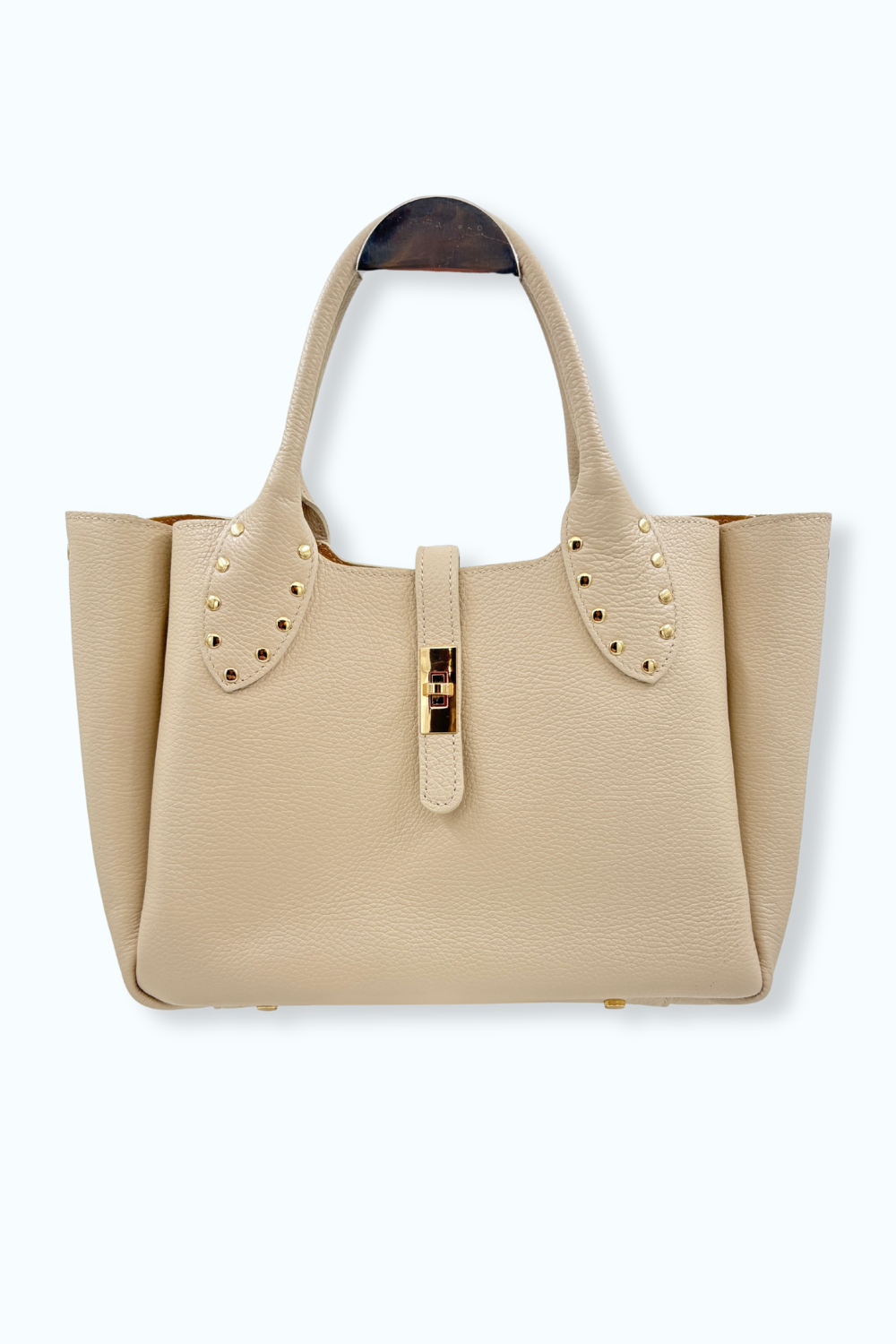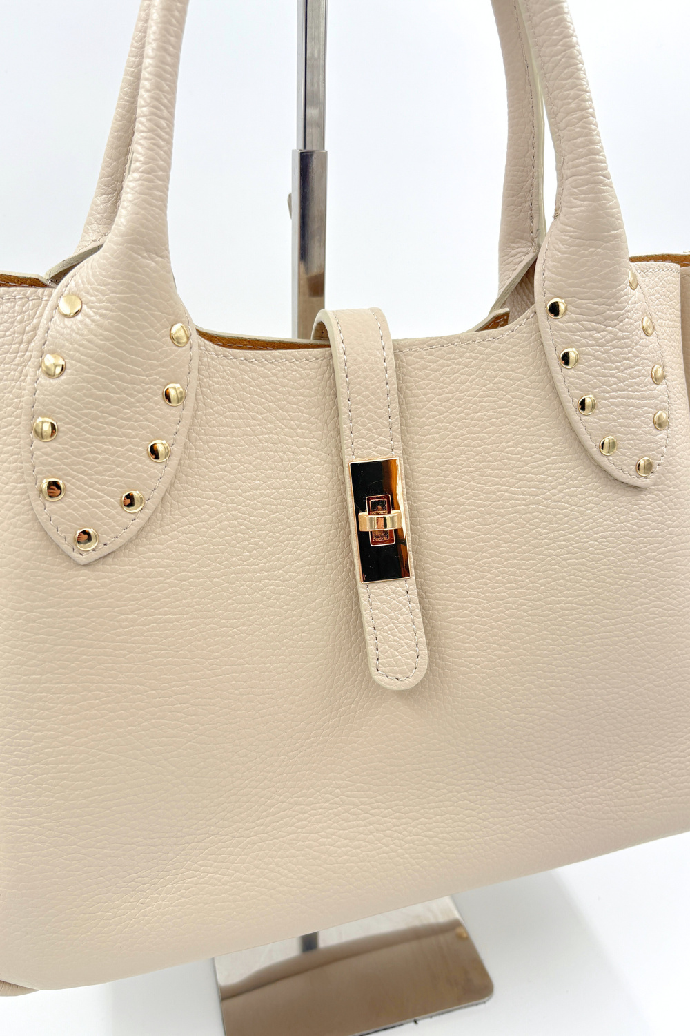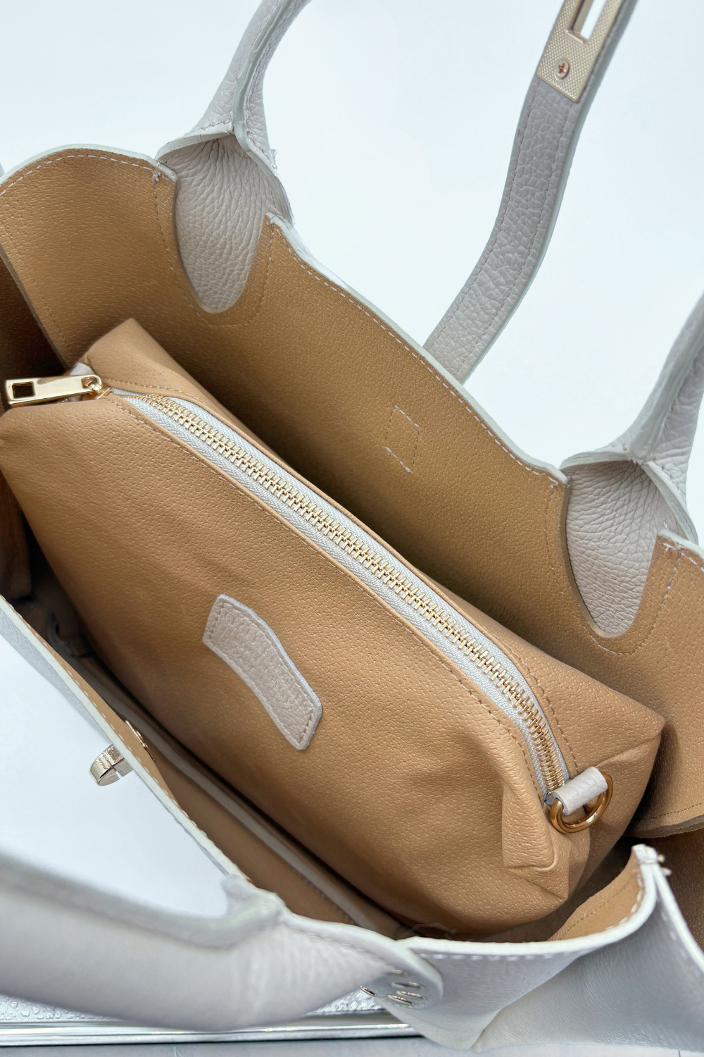 Ecru tas van echt leer met gouden details. Bevat extra loszittende tas aan binnenkant en een lange strap, zodat beide tassen ook gemakkelijk over de schouder te dragen zijn.
