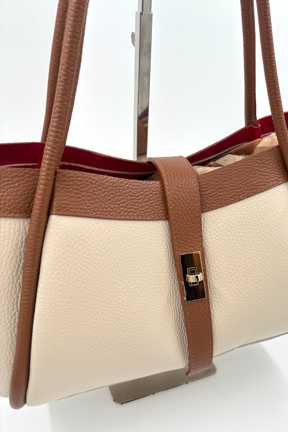 Ecru tas van echt leer met bruine en gouden details. Bevat extra loszittende tas aan binnenkant en een lange strap, zodat beide tassen ook gemakkelijk over de schouder te dragen zijn.