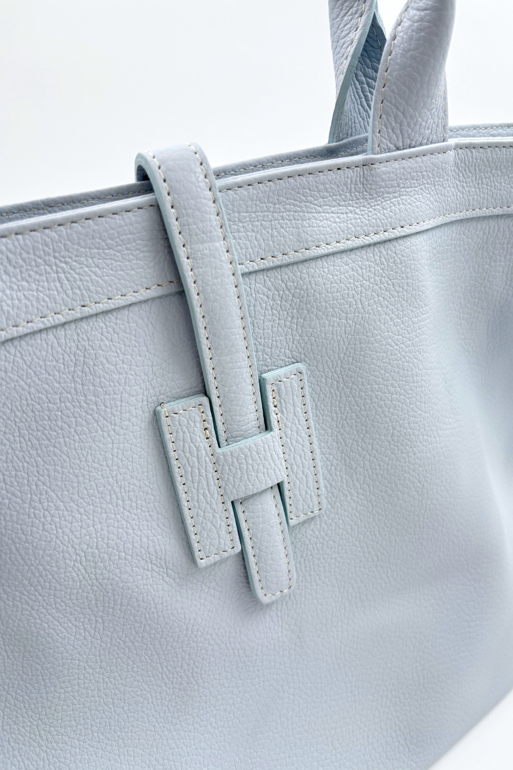 Tas van echt leer (vera pelle) gemaakt in Italië met lichtblauwe basis en gouden details. Bevat meerdere opbergvakken binnenin en een lange strap, zodat de tas ook gemakkelijk over de schouder te dragen is. Ook in het zwart te verkrijgen.