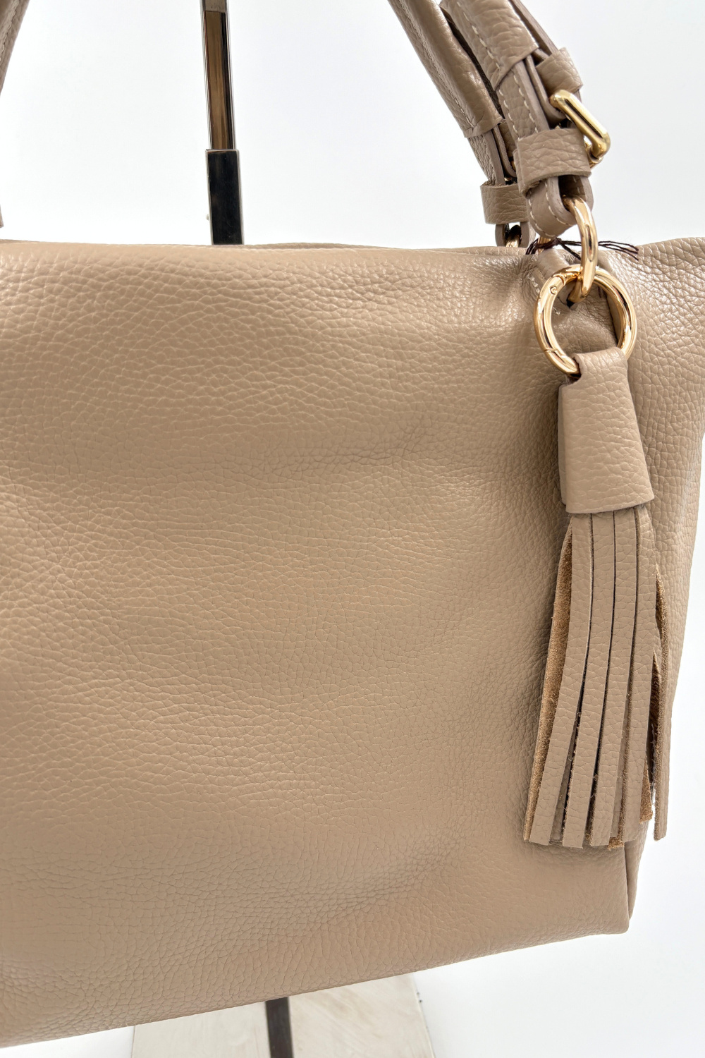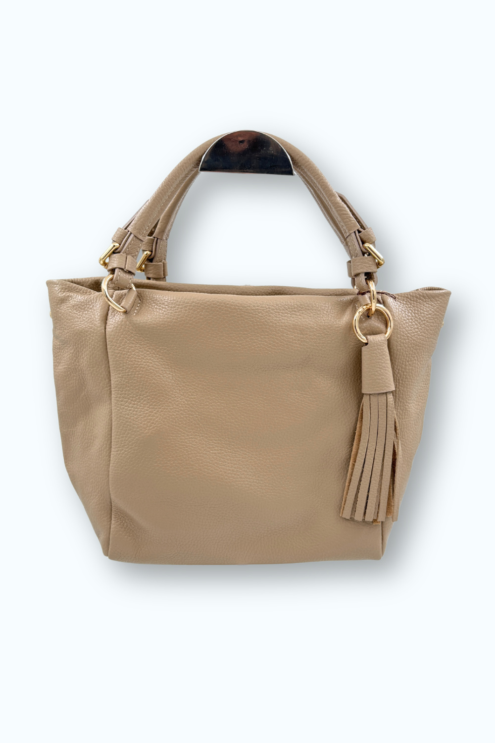 Tas van echt leer gemaakt in Italië met beige basis en gouden details. Bevat meerdere opbergvakken binnenin en een lange strap, zodat de tas ook gemakkelijk over de schouder te dragen is.