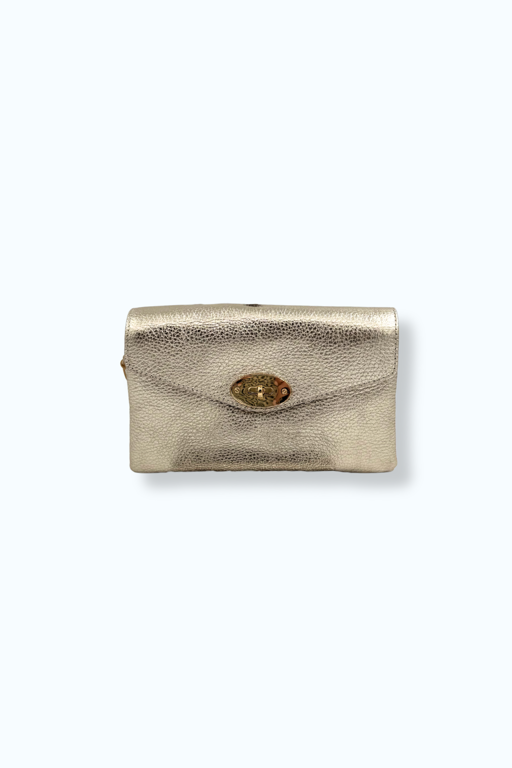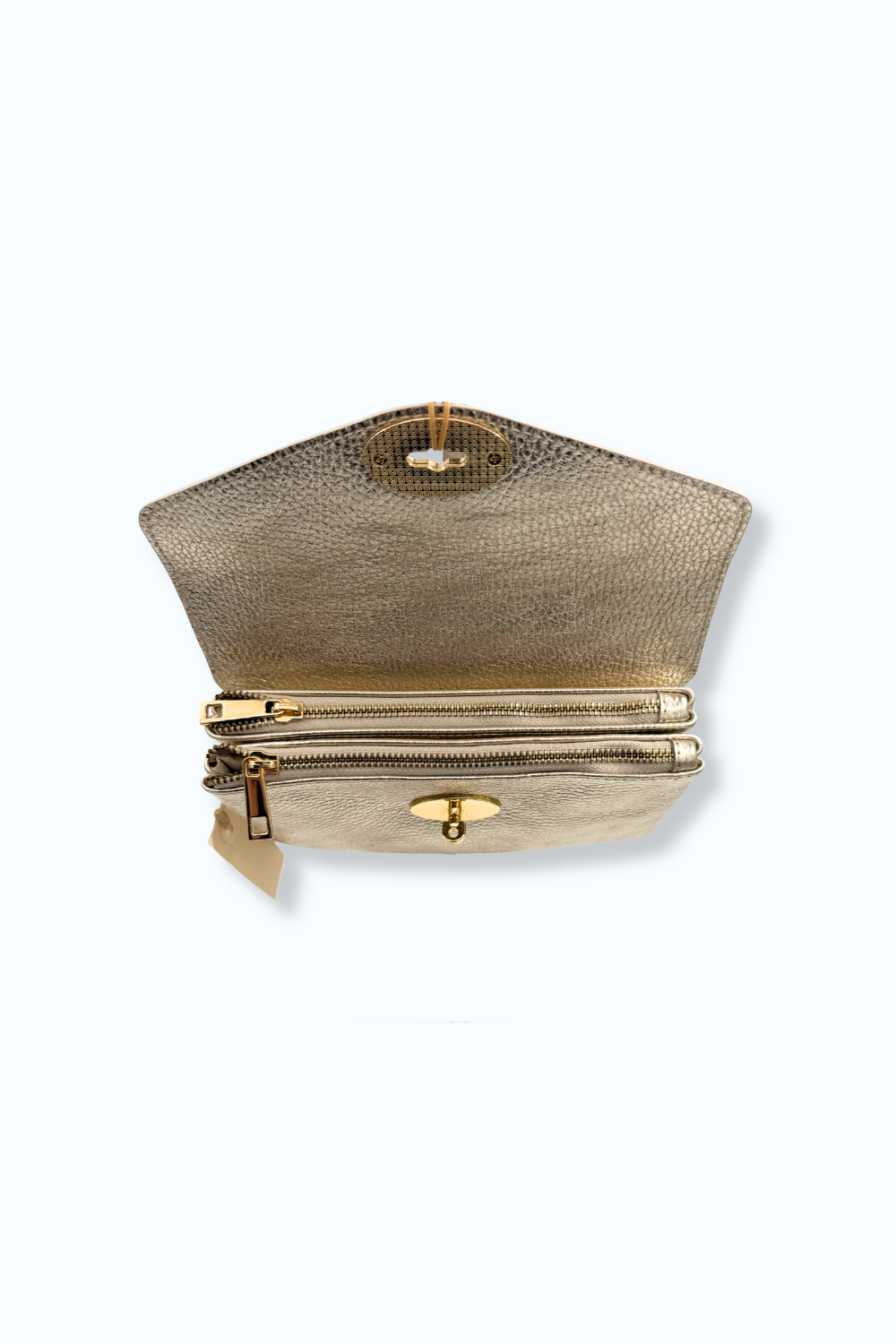 Goud gespoten tas van het merk Giuliano met gouden details. Bevat twee opbergvakken met rits binnenin en een lange strap, zodat het tasje ook gemakkelijk over de schouder te dragen is.