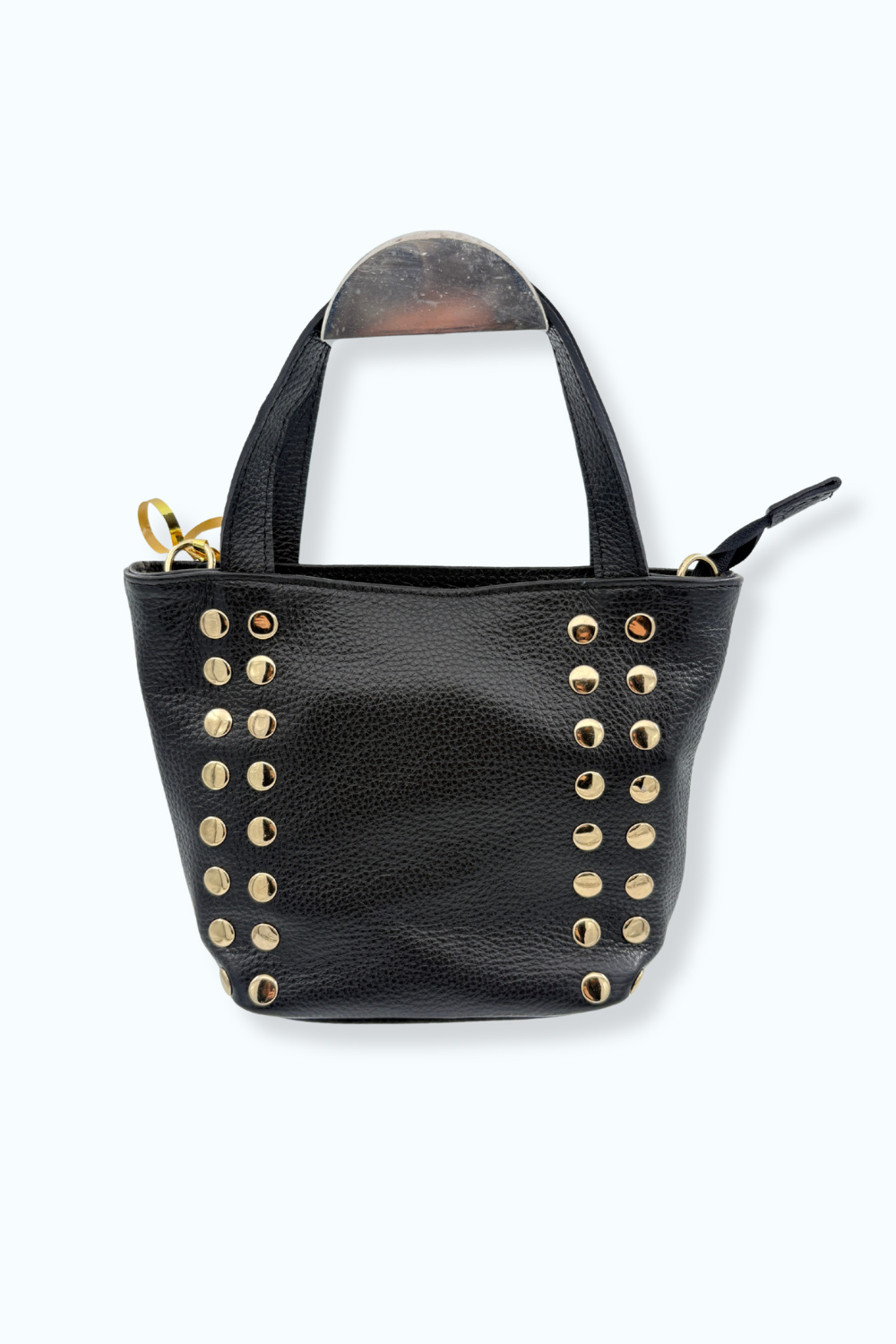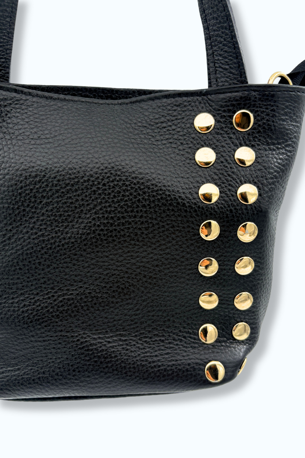 Zwarte tas van echt leer, gemaakt in Italië, met mooie gouden details. Bevat een extra opbergvak met rits binnenin en een lange strap, zodat de tas ook gemakkelijk over de schouder te dragen is.