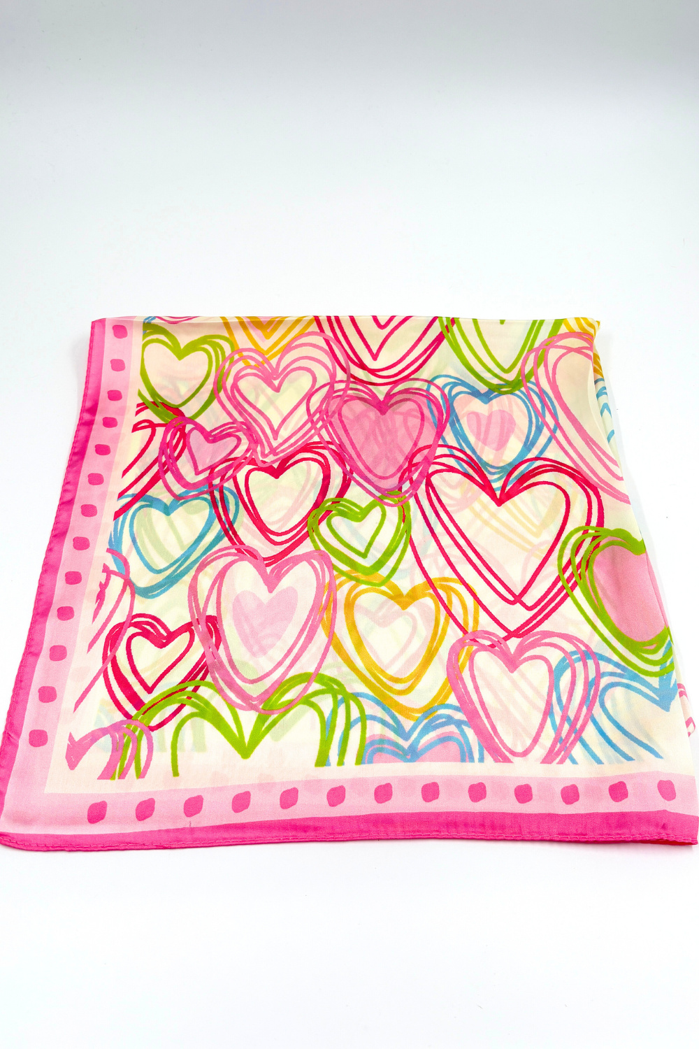 Zachte sjaal met roze/witte basis en een harten-motief. Te dragen om de nek, maar ook leuk in het haar of aan een tas te knopen.