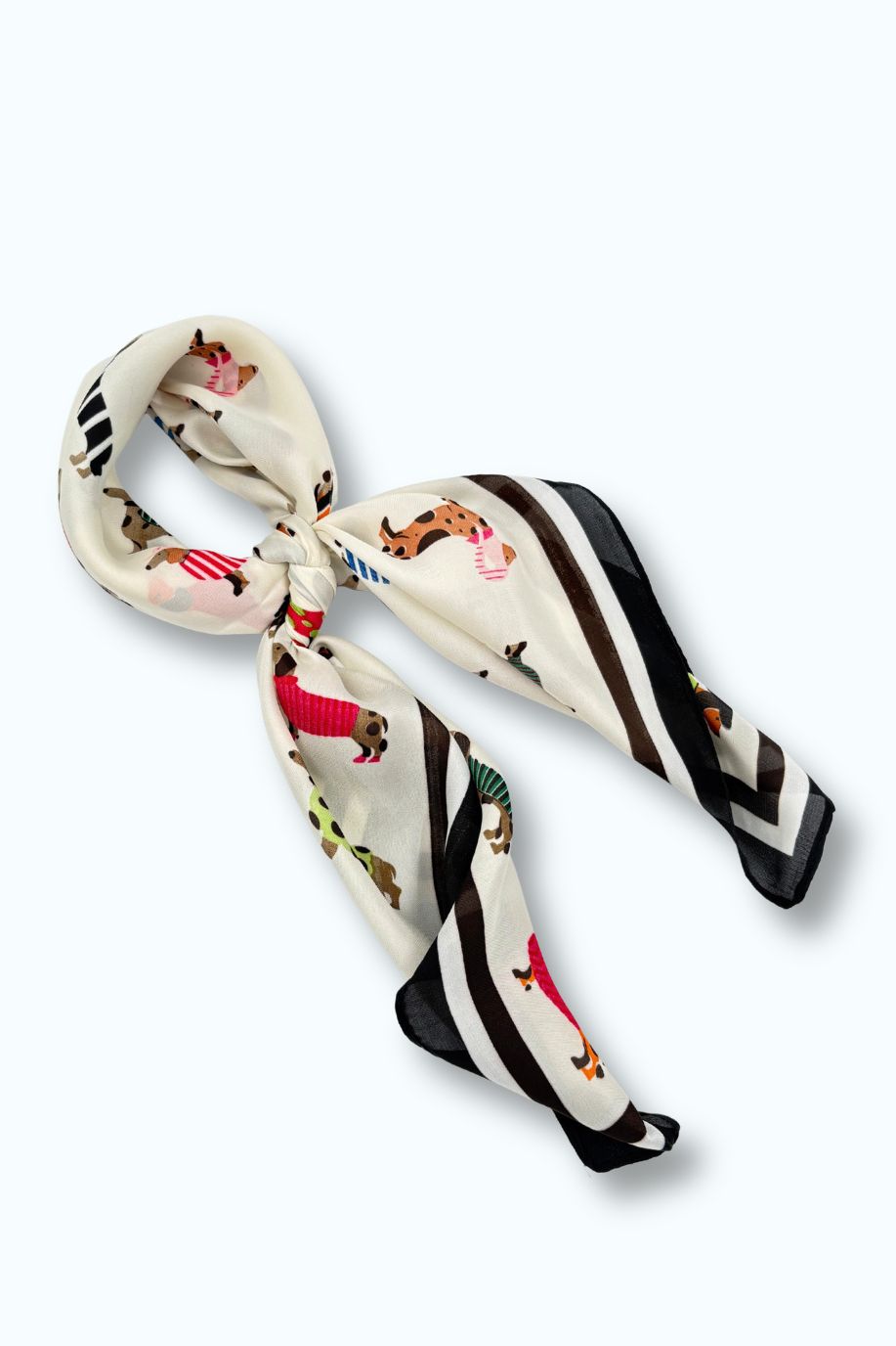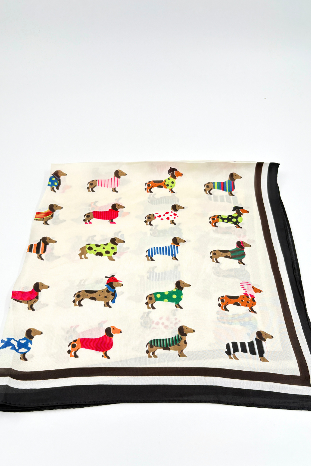 Zachte sjaal met ecru basis en een teckel-motief. Te dragen om de nek, maar ook leuk in het haar of aan een tas te knopen.