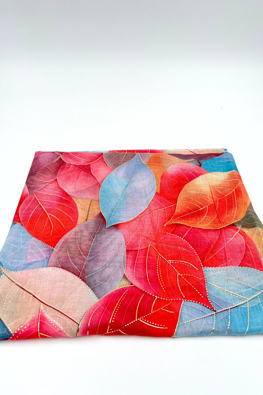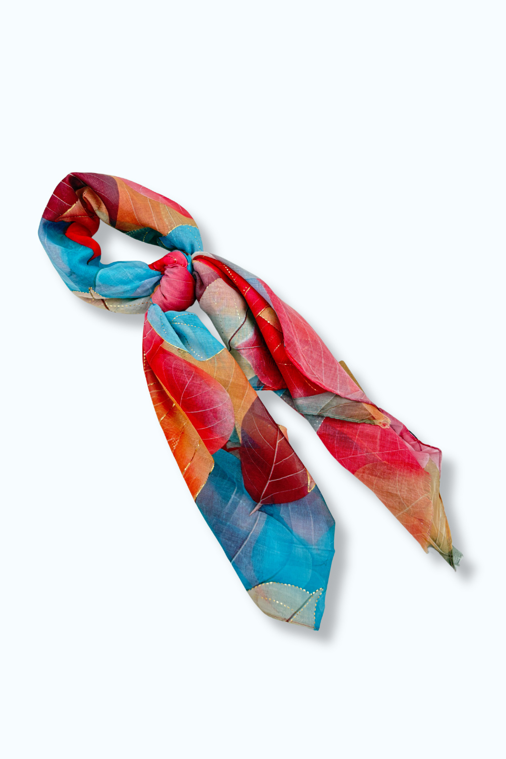 Zachte sjaal met roze / multi colour blad-motief en gouden details. Te dragen om de nek, maar ook leuk in het haar of aan een tas te knopen. Ook in het blauw / multi colour te verkrijgen.