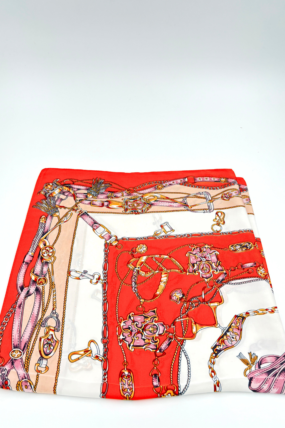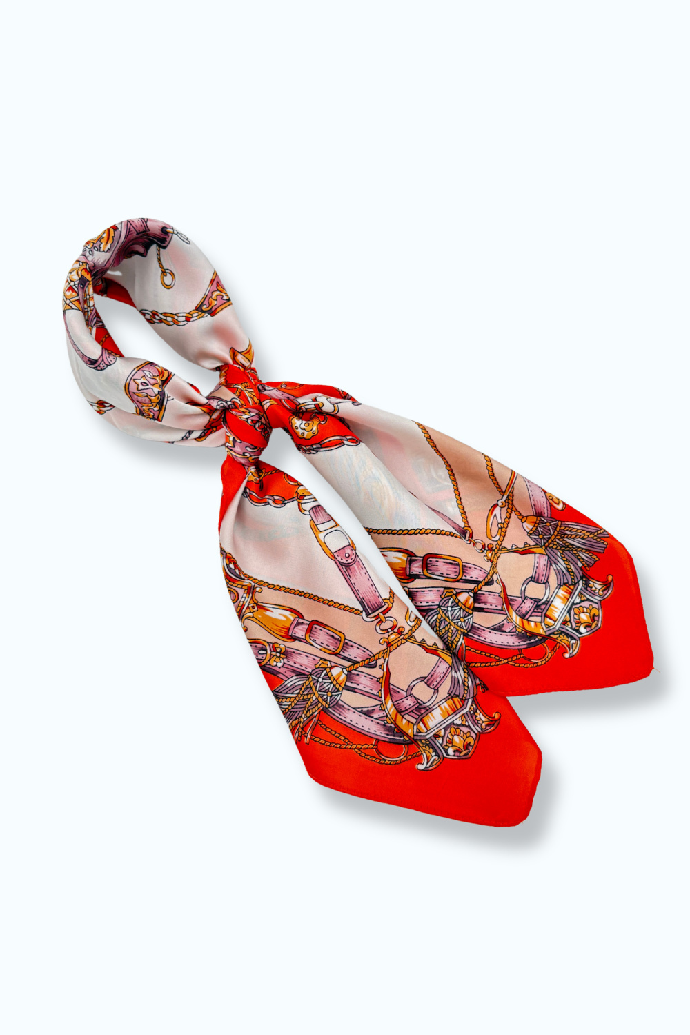 Zachte sjaal met oranje, wit en beige baroque-motief. Te dragen om de nek, maar ook leuk in het haar of aan een tas te knopen.