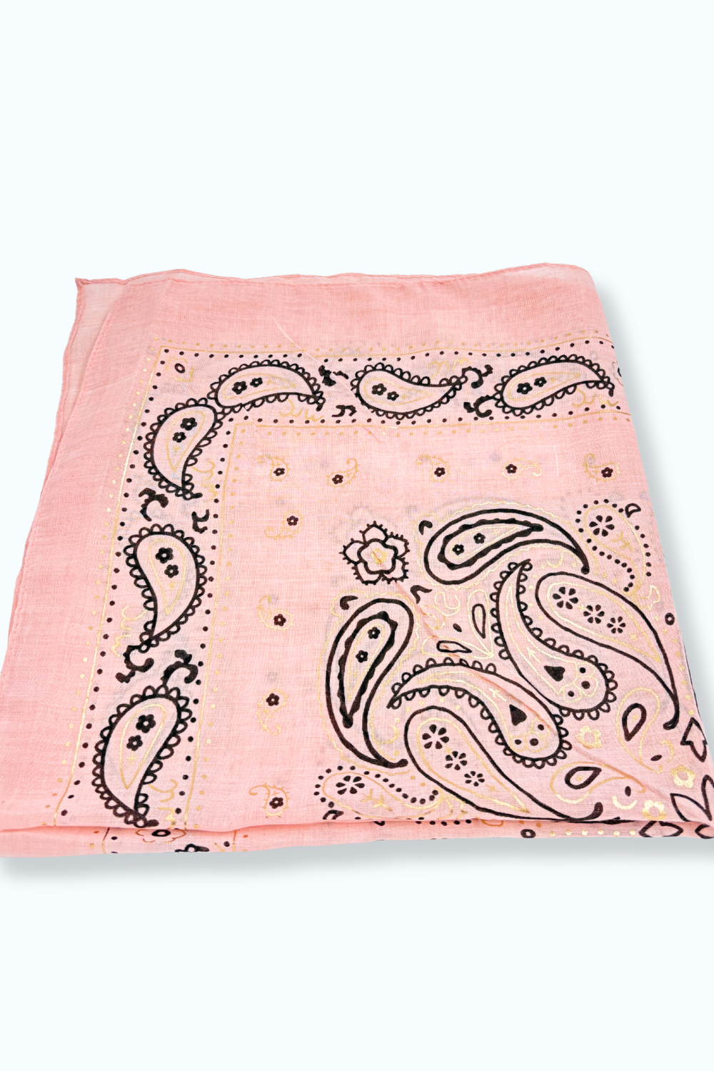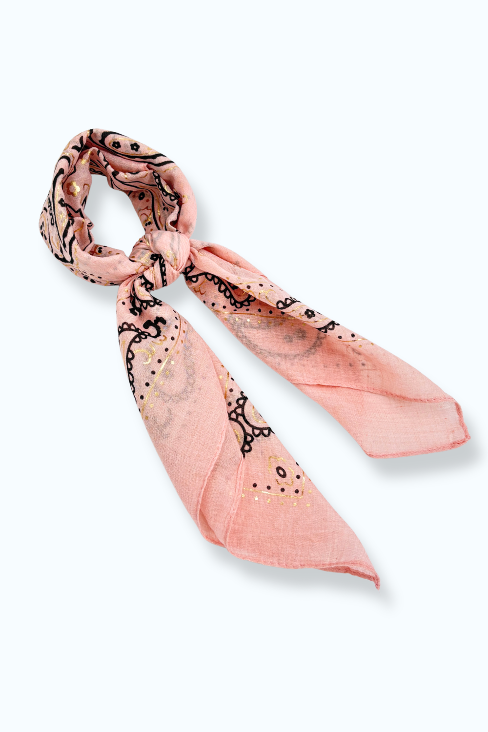 Roze sjaal met goud en zwart blad/bloem-motief. Te dragen om de nek, maar ook leuk in het haar of aan een tas te knopen.