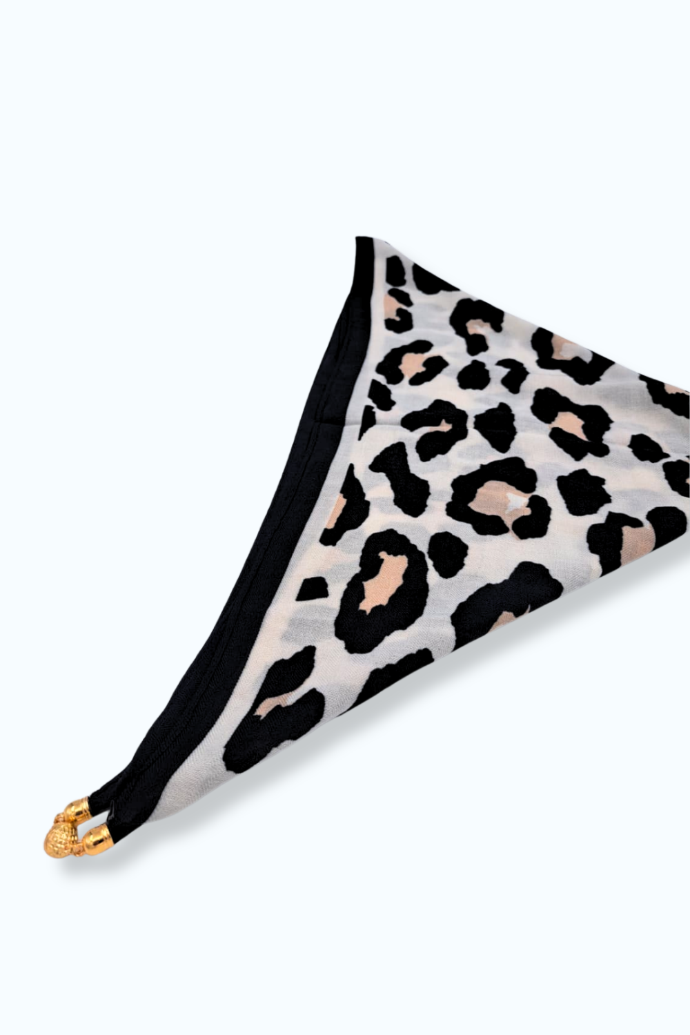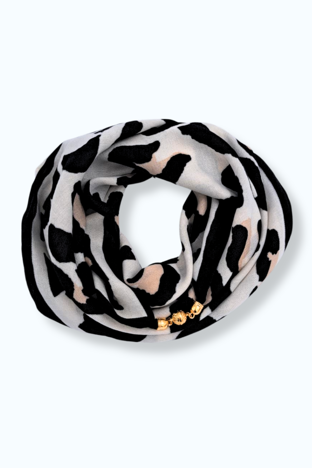 Zachte sjaal met panterprint en goudkleurige magnetische sluiting, zodat hij goed op zijn plek blijft zitten.