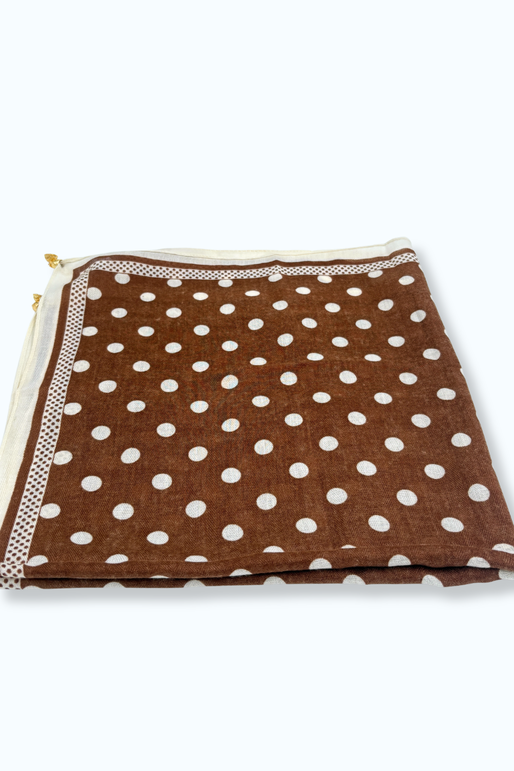 Zachte sjaal met creme stippen op een bruine basis en een goudkleurige magnetische sluiting, zodat hij goed op zijn plek blijft zitten.