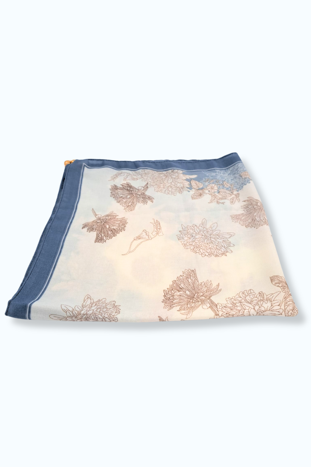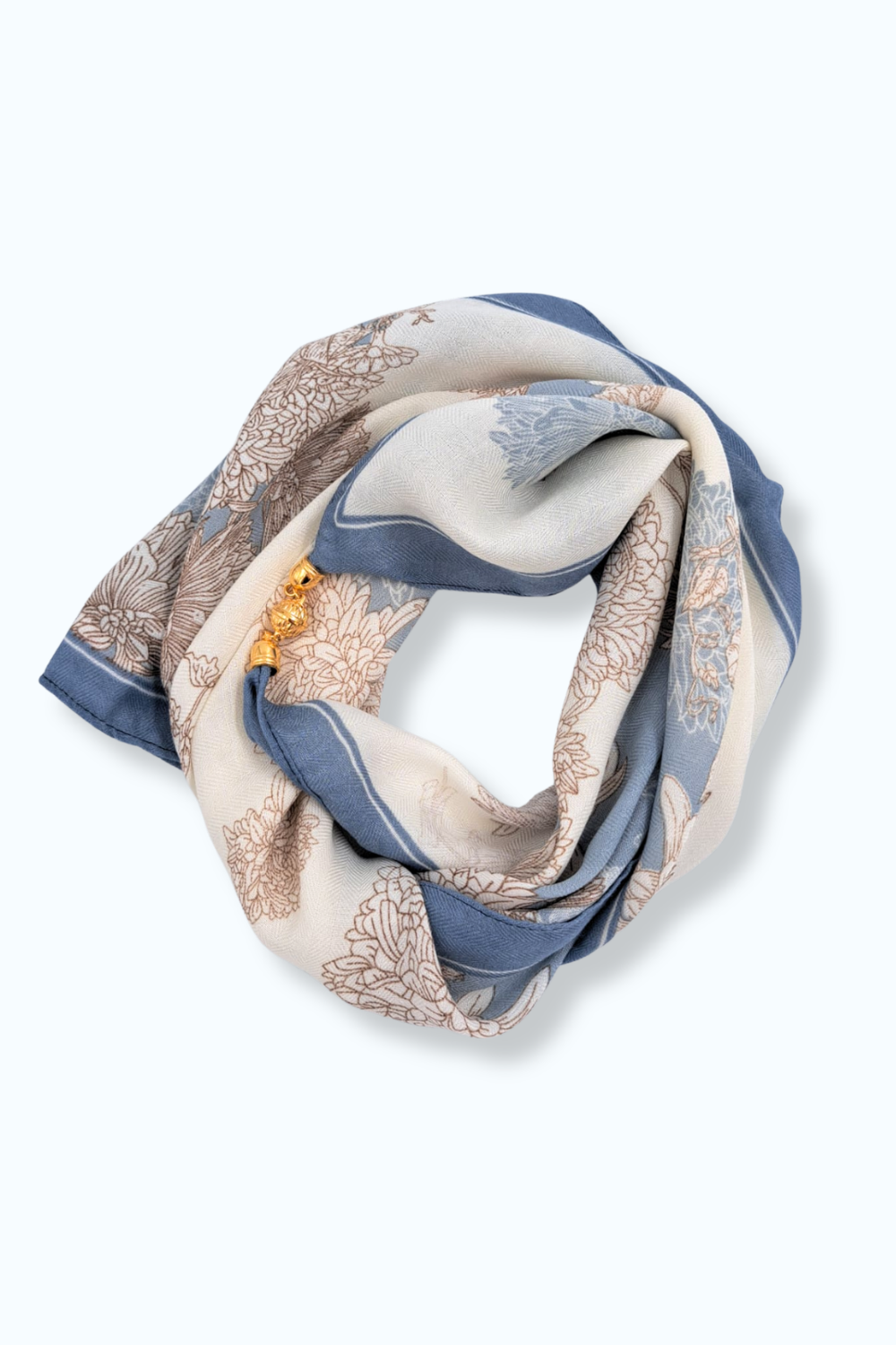 Zachte sjaal met een bloemenprint in de kleuren blauw en taupe. Bevat een goudkleurige magnetische sluiting, zodat hij goed op zijn plek blijft zitten.