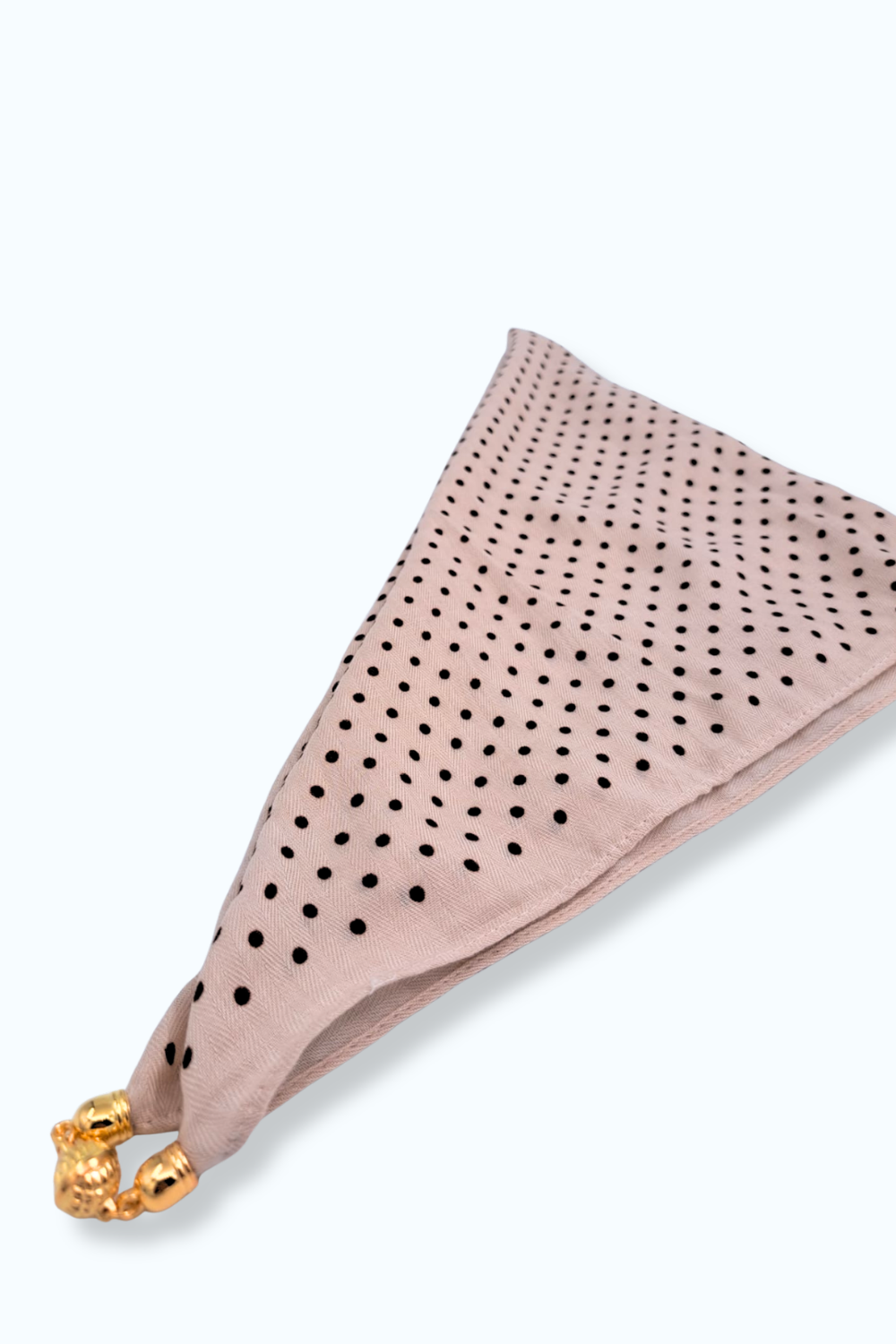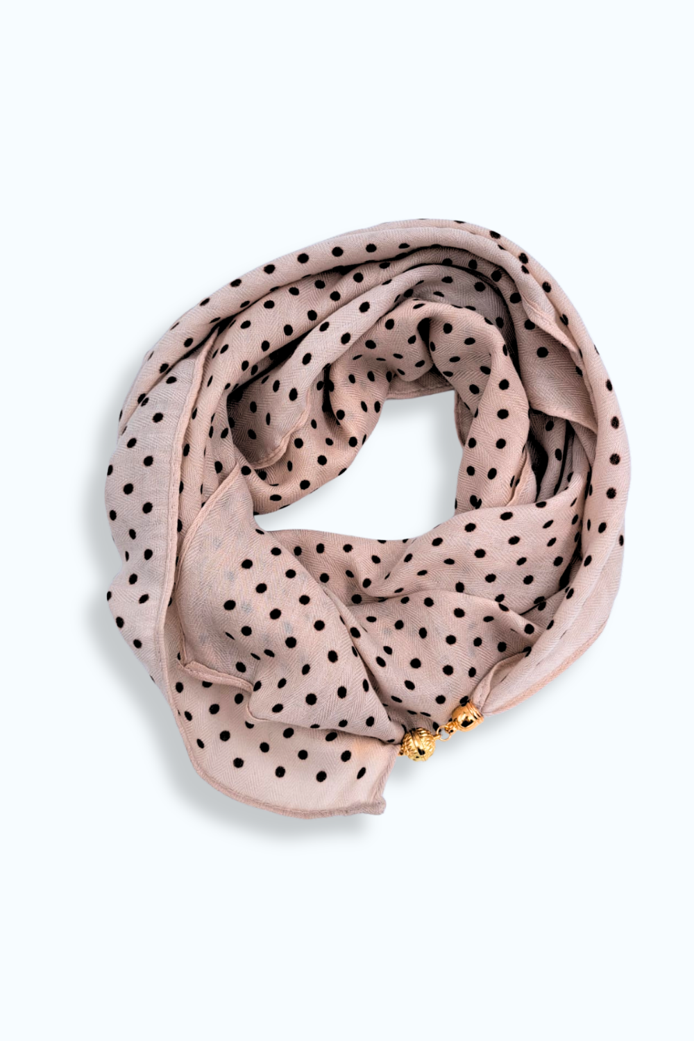 Zachte sjaal met een beige basis, een bruin stippenpatroon en goudkleurige magnetische sluiting, zodat hij goed op zijn plek blijft zitten.