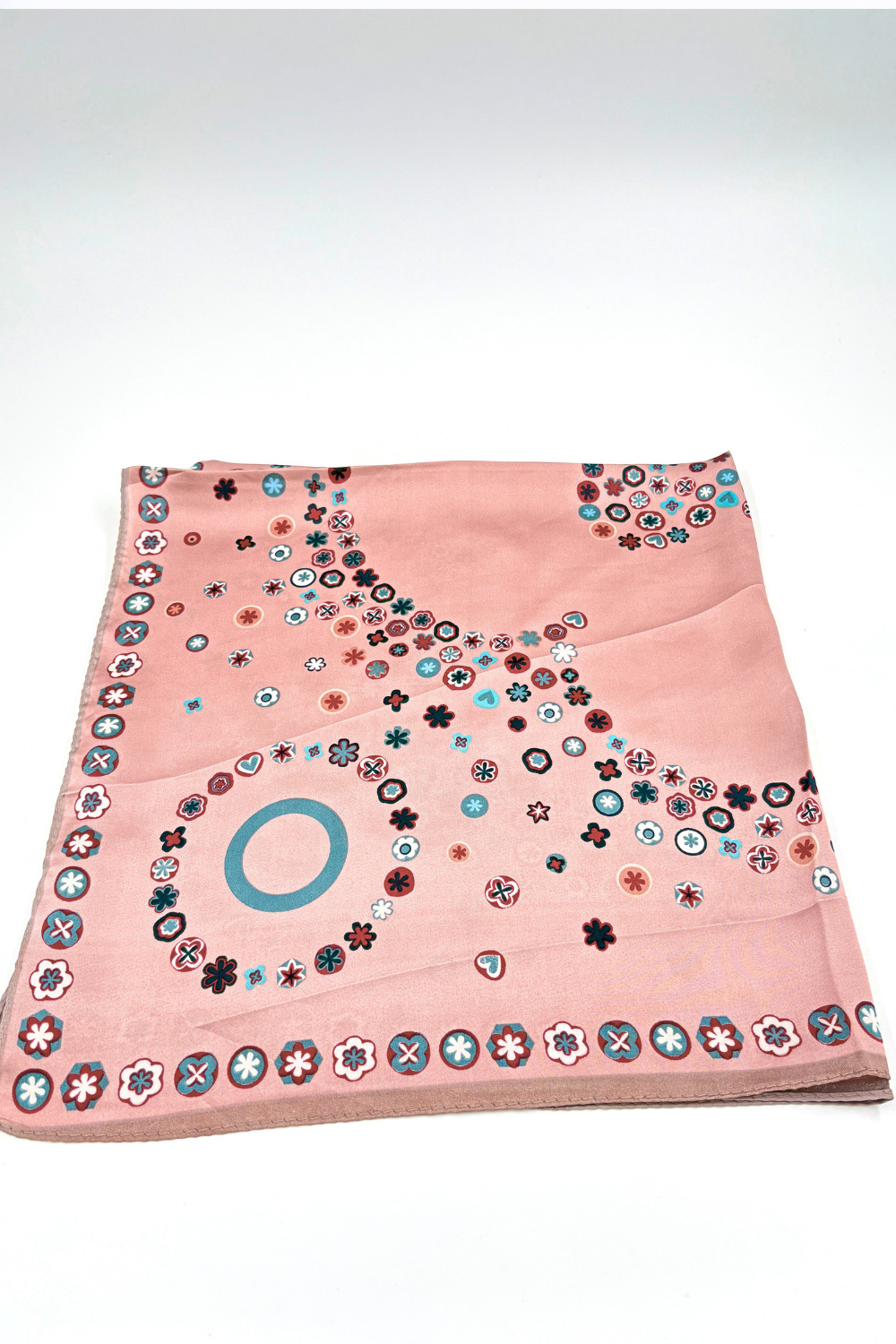 Zachte sjaal met roze basis en een bloemen en harten-motief. Te dragen om de nek, maar ook leuk in het haar of aan een tas te knopen. Ook in het groen te verkrijgen.