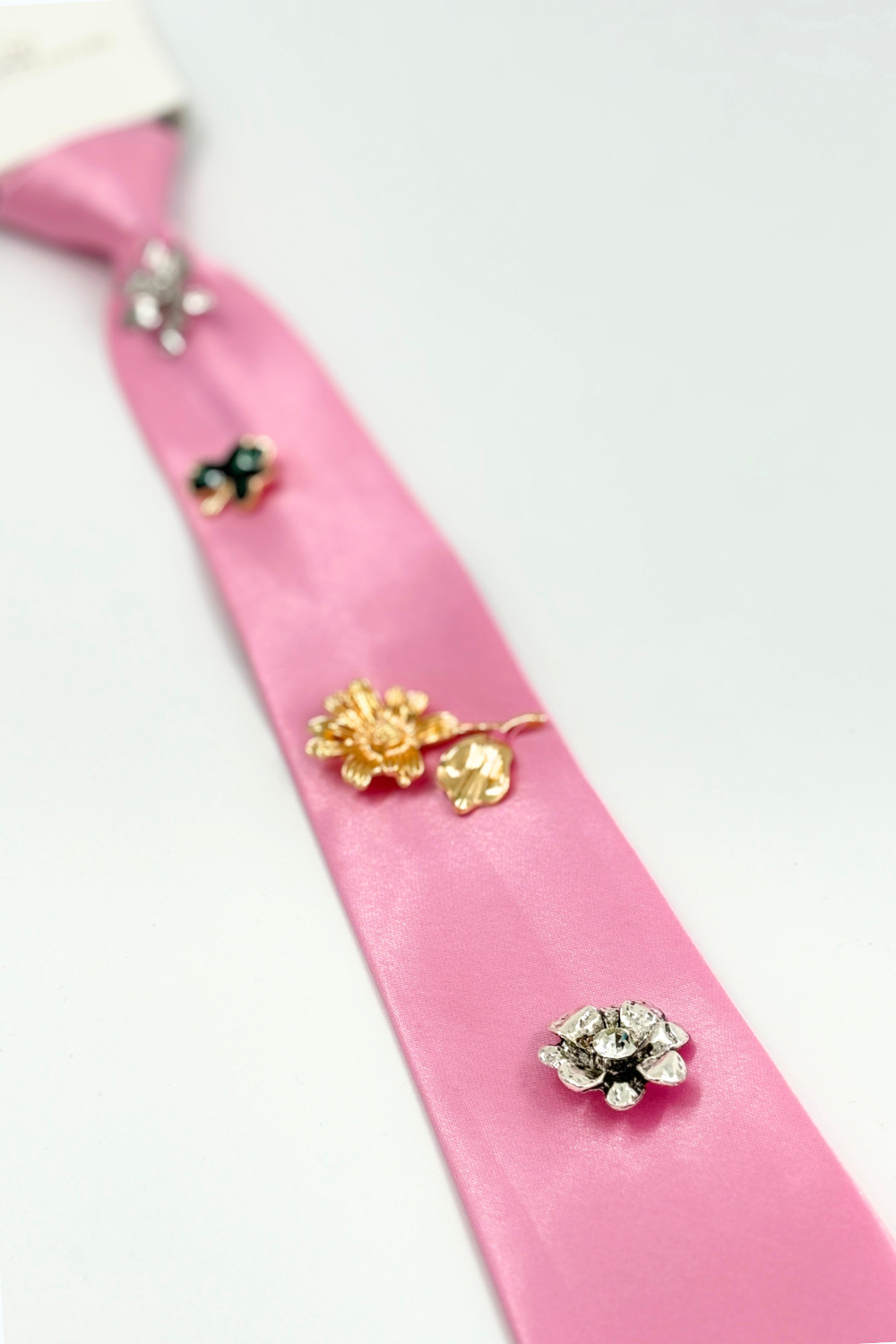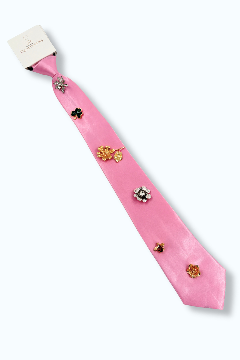 Roze, handgemaakte das van het merk J.M Accessori met verscheidene gouden en zilveren broches and pins. Ook te verkrijgen in de kleuren goud, zwart, lichtblauw en wit.