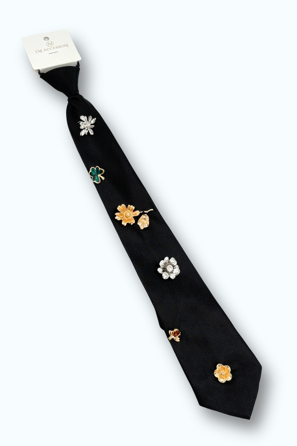 Zwarte, handgemaakte das van het merk J.M Accessori met verscheidene gouden en zilveren broches and pins. Binnenkort ook in meerdere kleuren te verkrijgen.