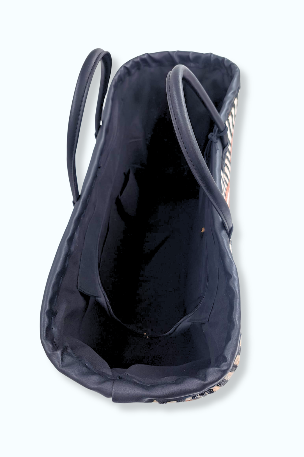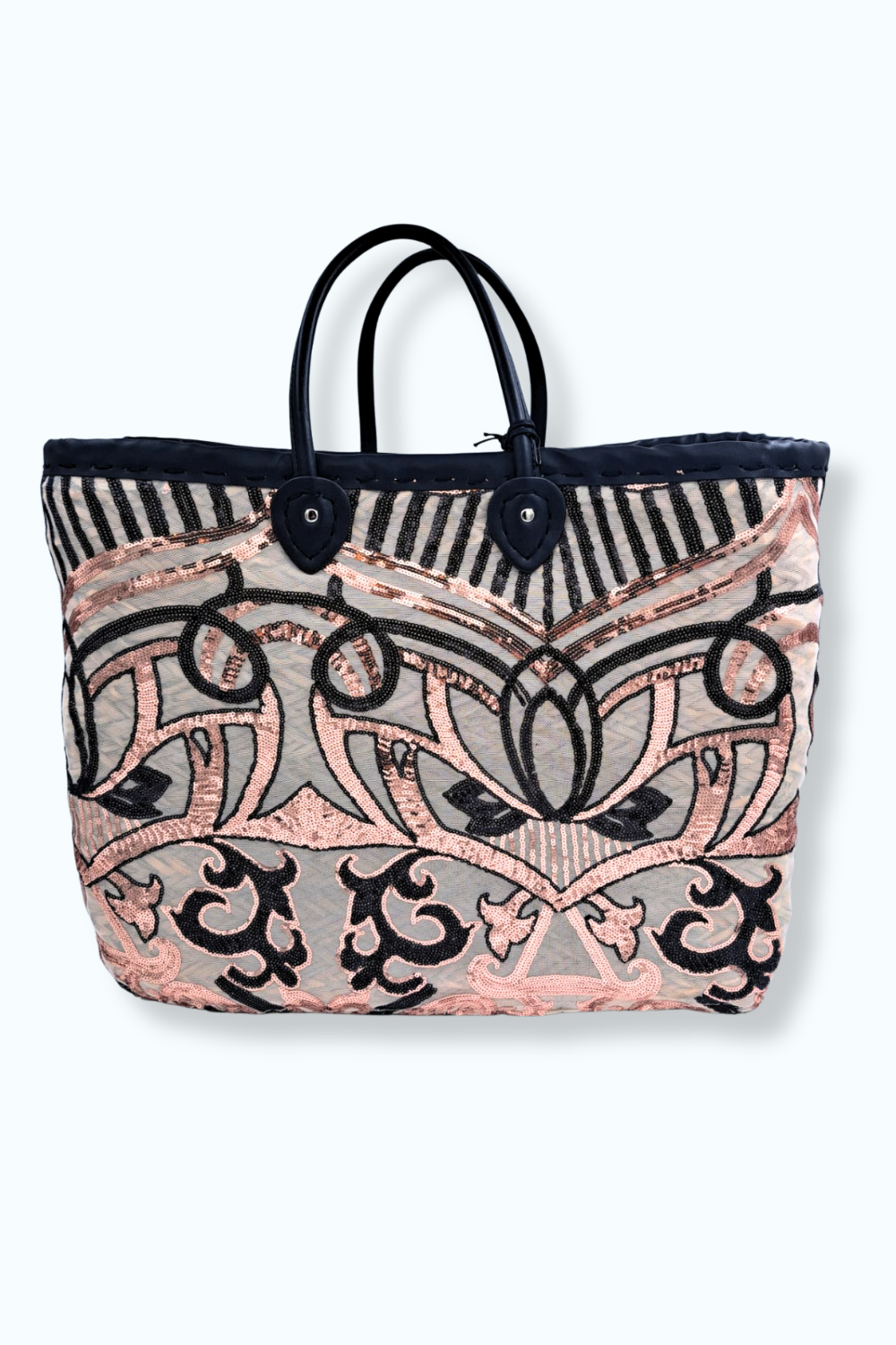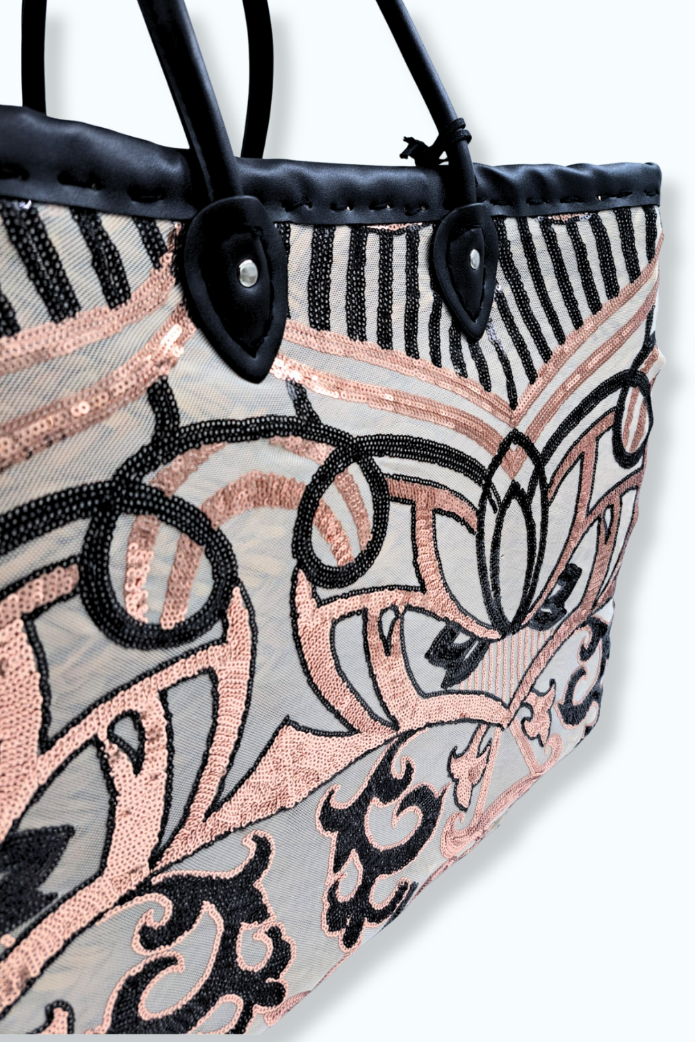 Prachtige (boodschappen)-tas van riet met stoffen binnenkant en een buitenkant belegd met zwarte en gouden pailletten op een mesh basis. Bevat een ritssluiting.