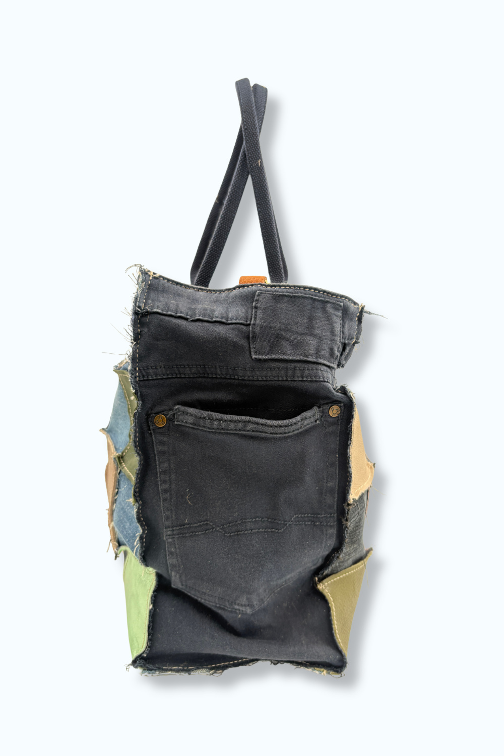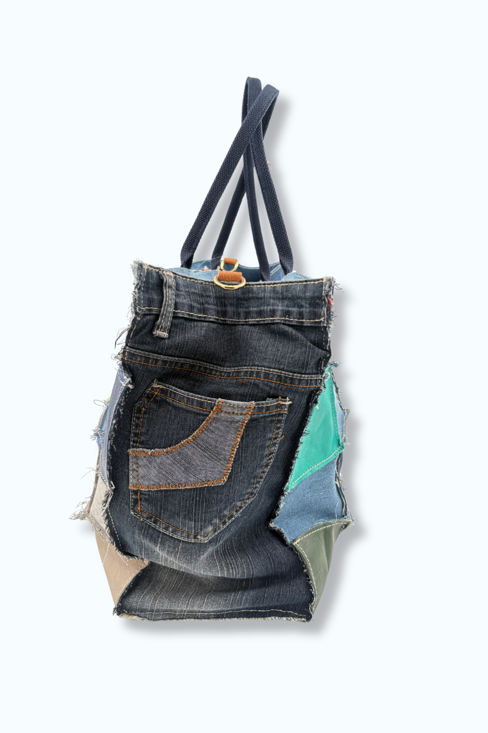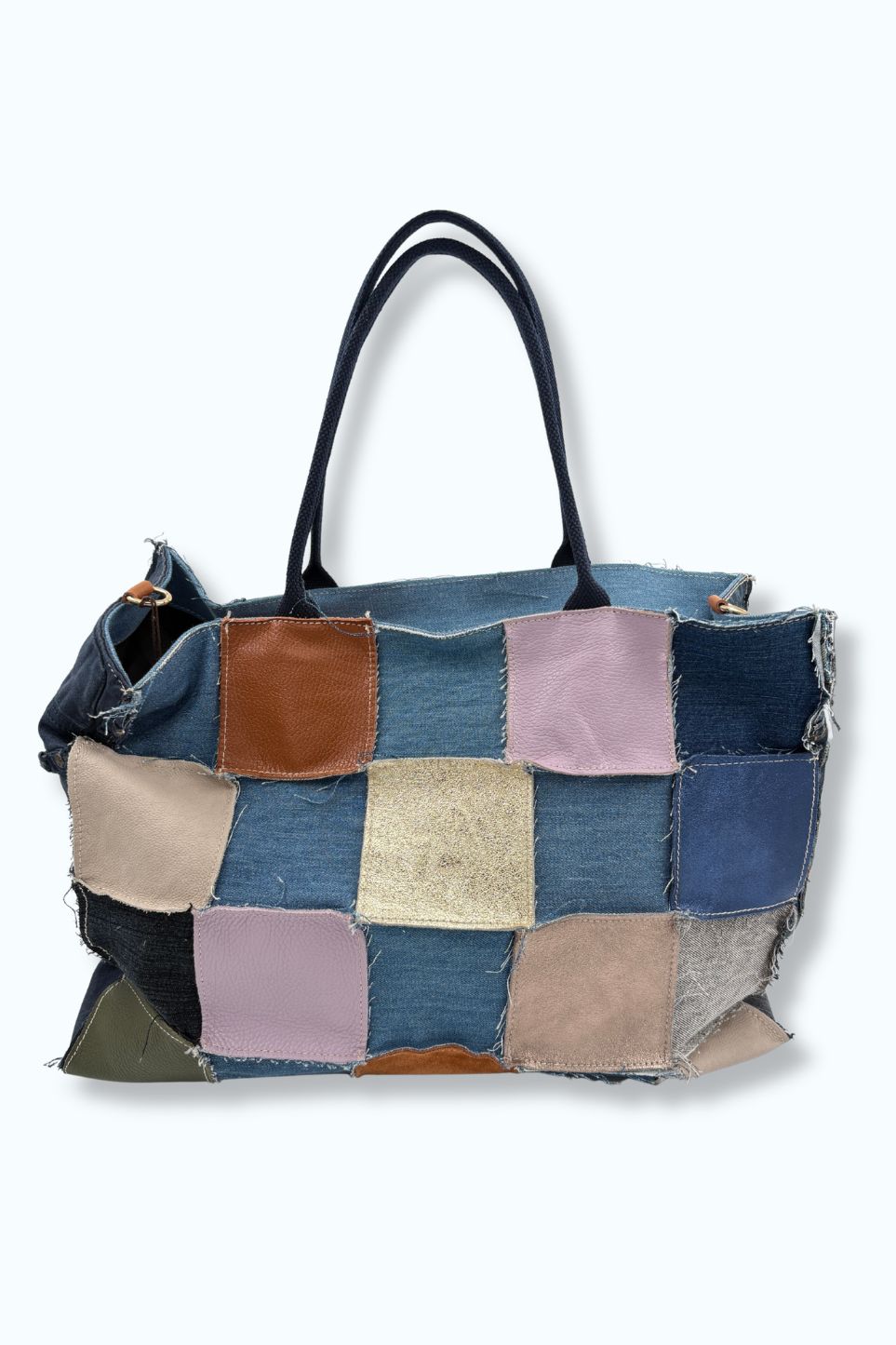 Tas in een combi van denim en echt leer gemaakt in Italië. Bevat een extra opbergvak binnenin en een lange strap, zodat de tas ook gemakkelijk over de schouder te dragen is.