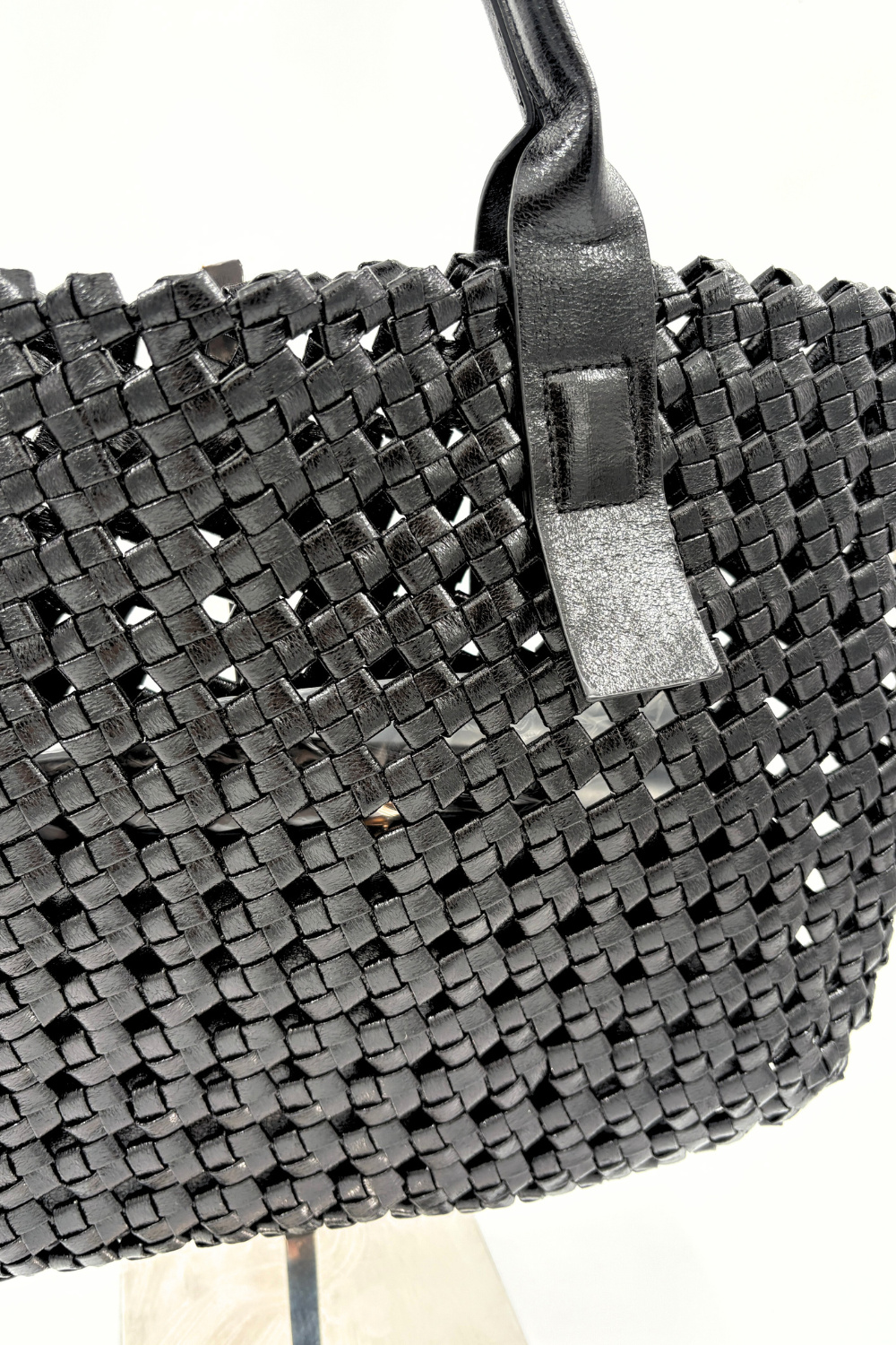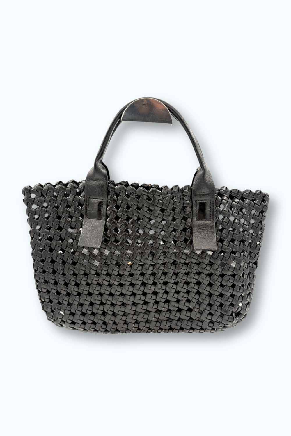 Geweven tas van polyurethaan met uitneembare onderkant en extra bijpassend tasje. Ook te verkrijgen in de kleuren roze en brons.
