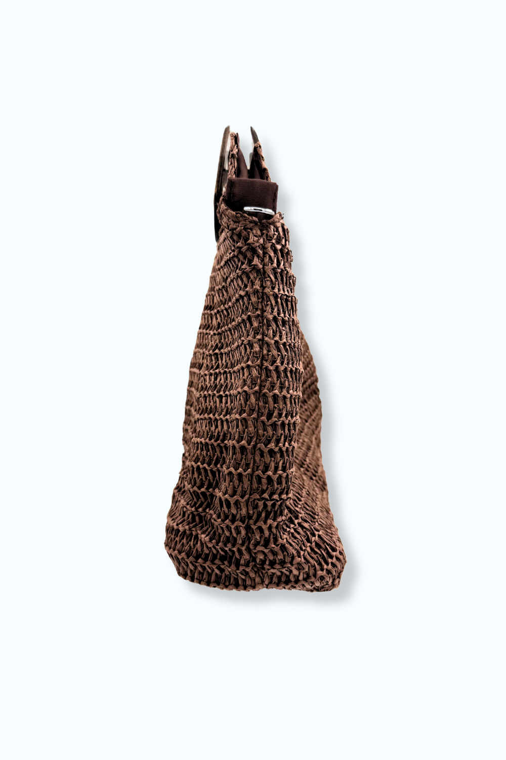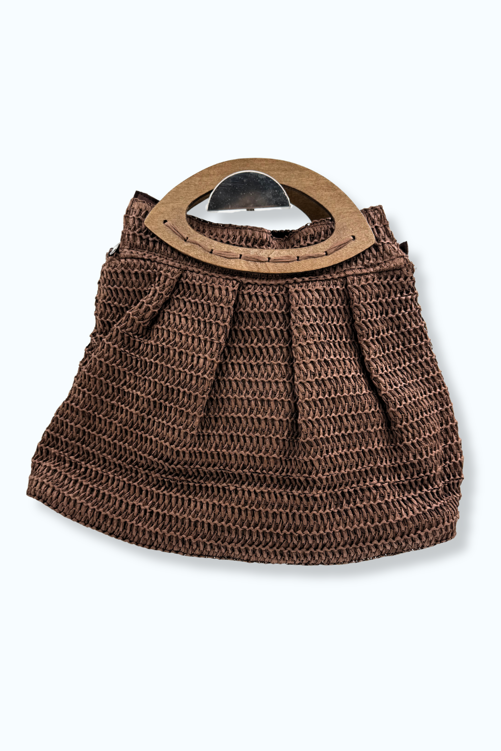 Bruine, geweven tas van polyurethaan met unieke houten handels, ritssluiting en een extra lange strap, zodat de tas ook gemakkelijk over de schouder te dragen is. Ook in het zwart te verkrijgen.