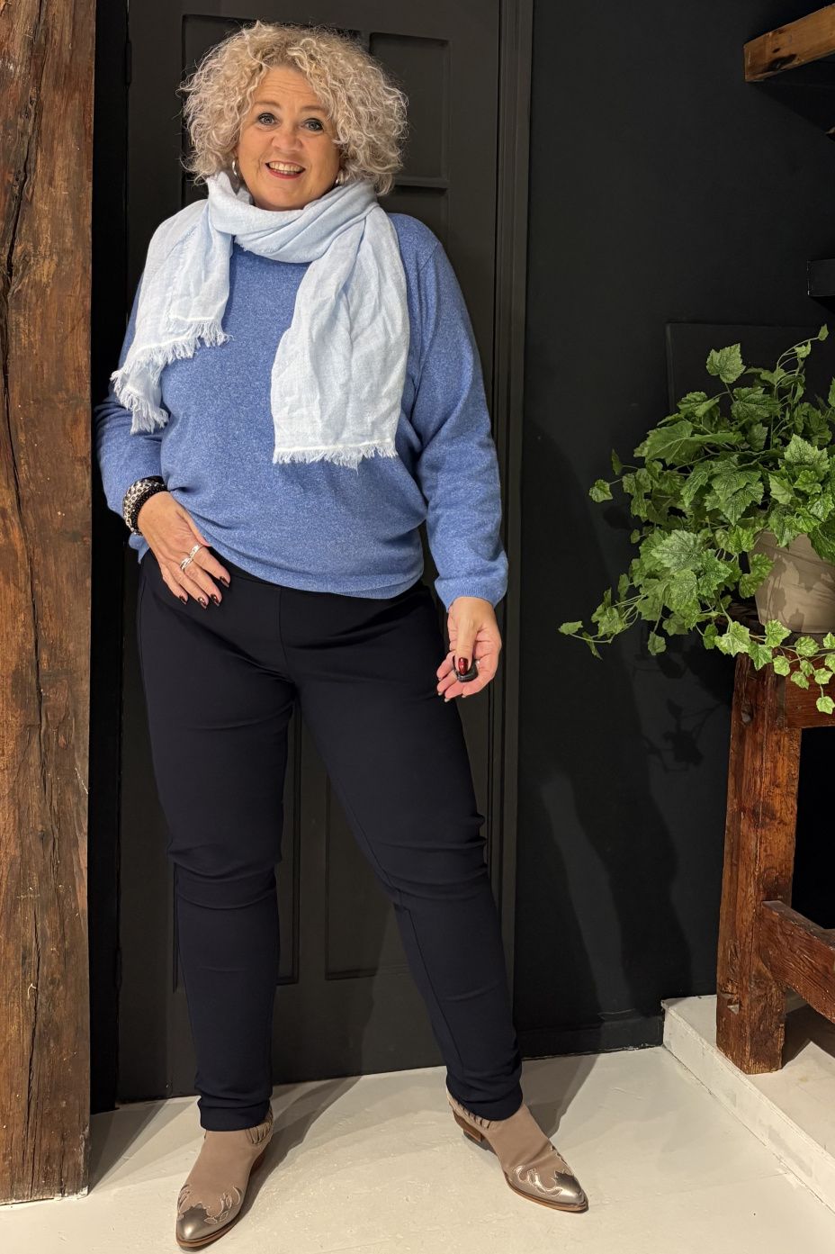 De broekspijp is voorzien van een extra zijnaad , dit geeft een optisch versmallend effect.