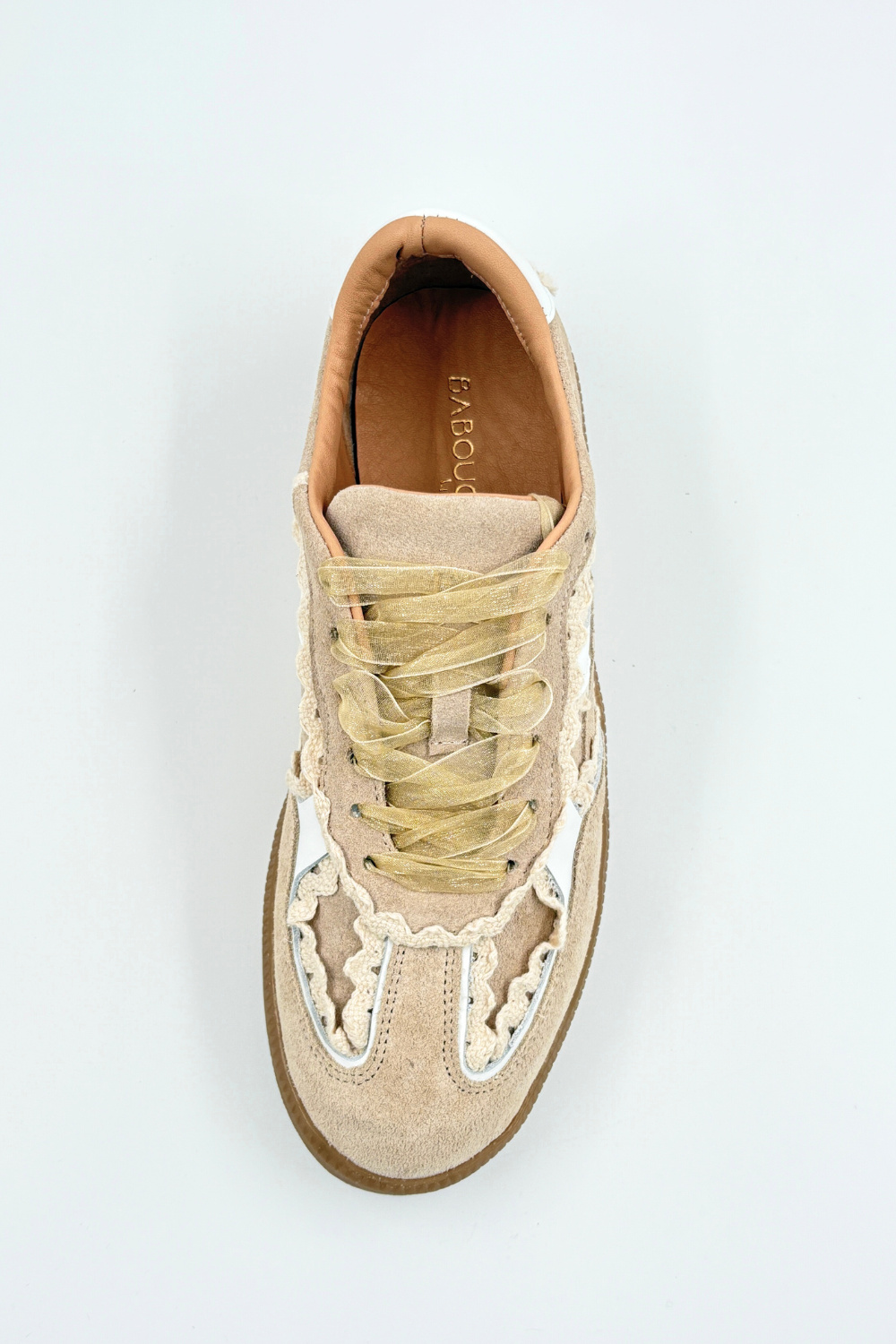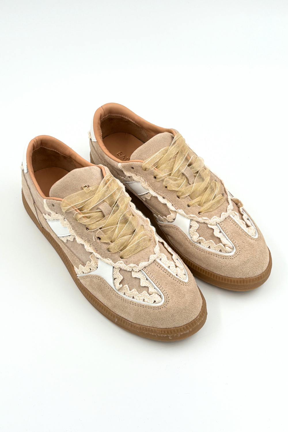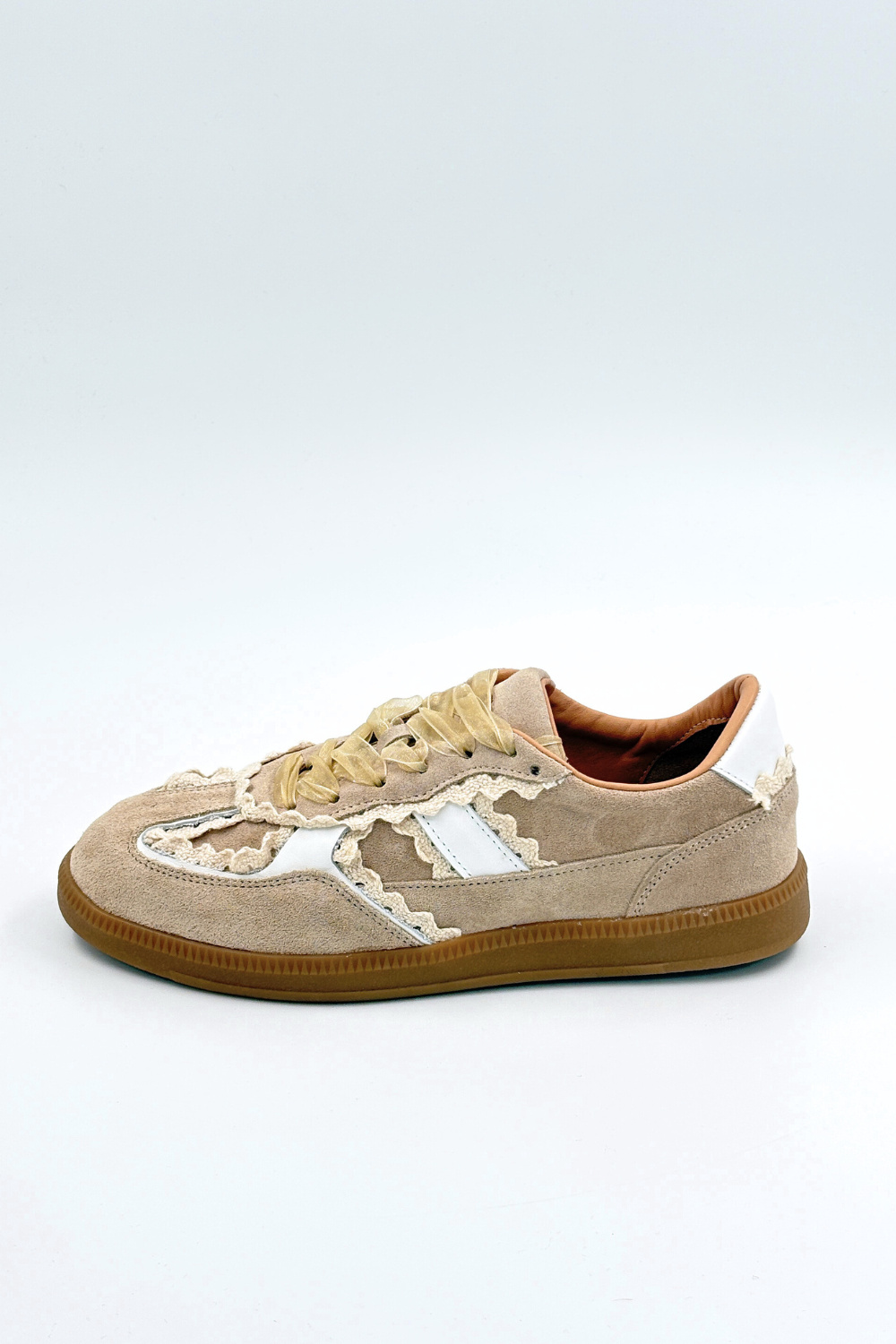 Deze luxe sneaker is waar moderne stijl en verfijnde elegantie samenkomen. Het strakke silhouet wordt versterkt door een subtiel kantdetail dat een onverwacht modieus en vrouwelijk accent toevoegt. Gemaakt van hoogwaardige materialen en ontworpen met oog voor detail, biedt deze sneaker niet alleen comfort, maar ook een statement van eigentijdse klasse. Perfect voor wie moeiteloos wil schakelen tussen casual chic en elegante allure.