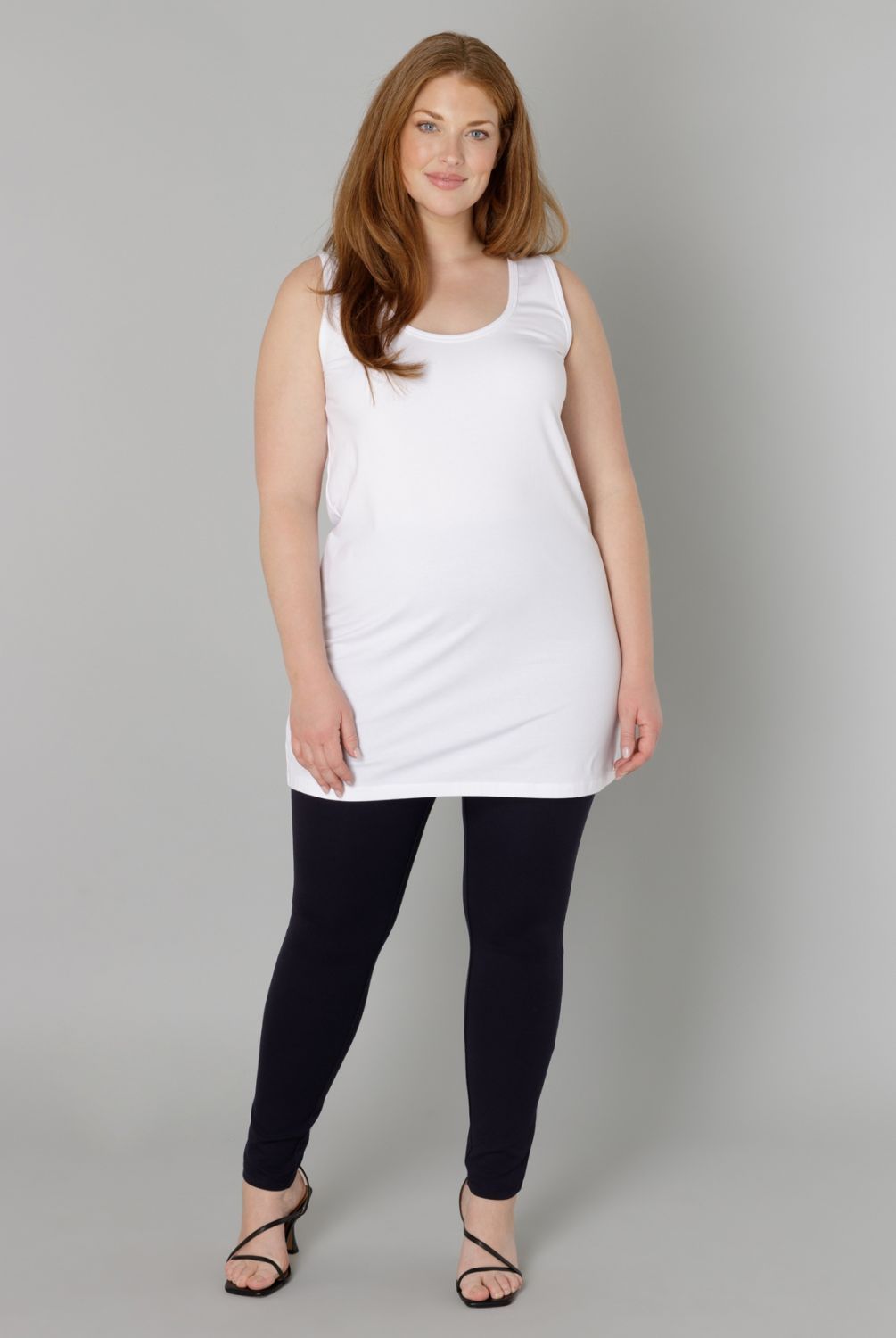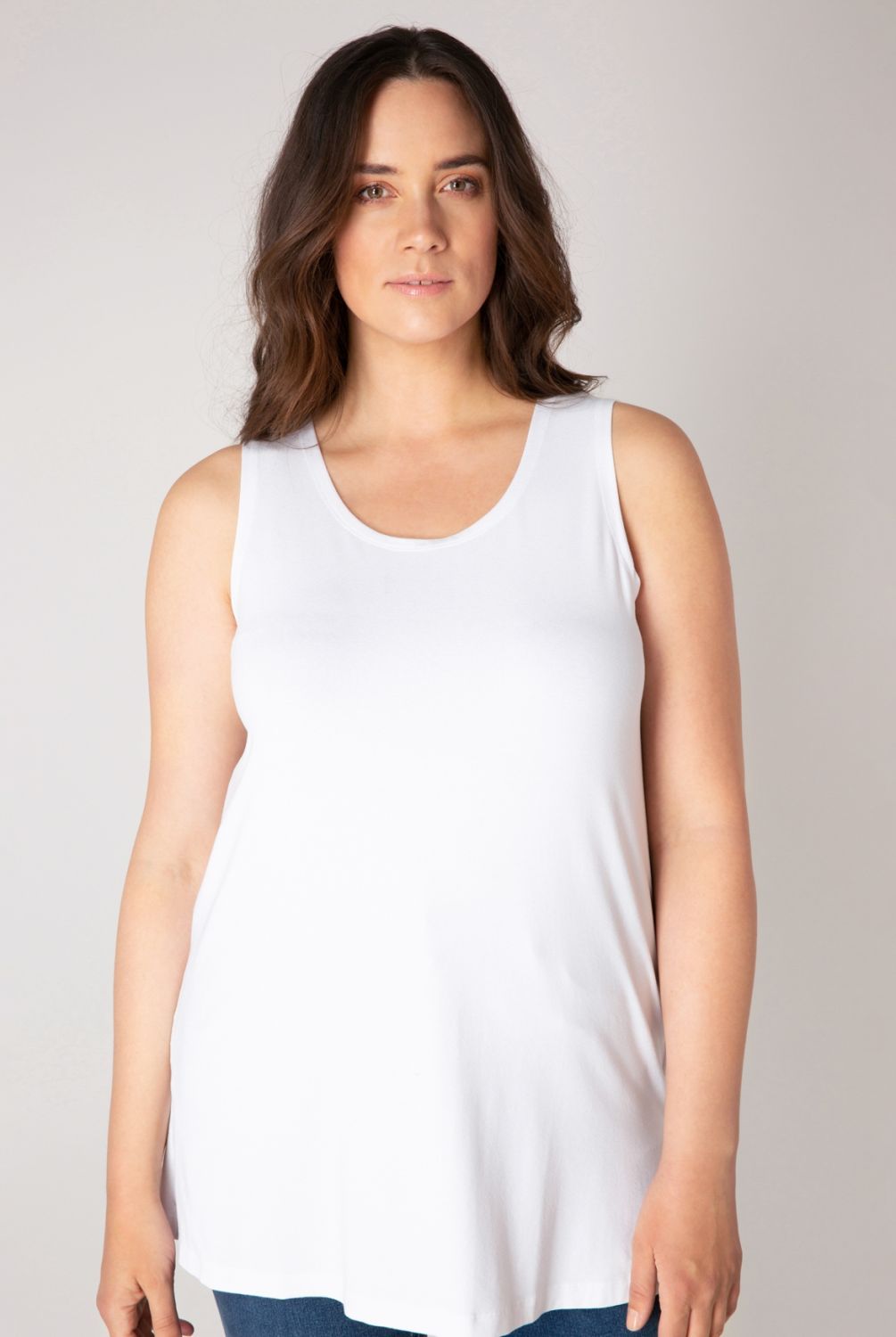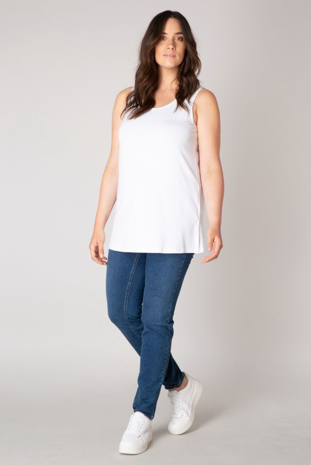 De Alicia van Base Level Curvy is een A-lijn top met brede banden in een zachte viscose kwaliteit. De top heeft een ronde hals en zijsplitten aan de onderkant.
