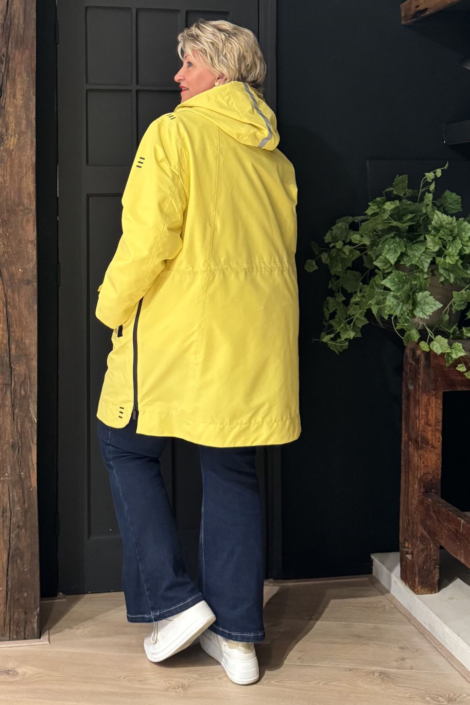 Het jack heeft een capuchon met verstelbare koord. Het heeft getapete naden en is waterdicht met een waterkolomdruk van 5000 mm.