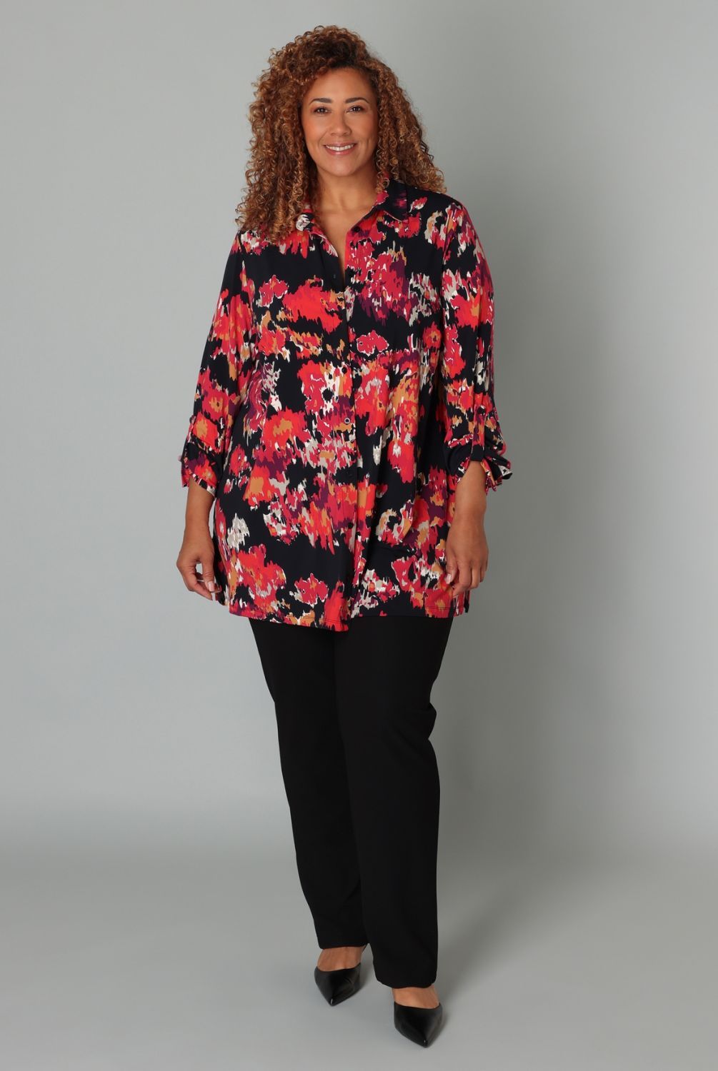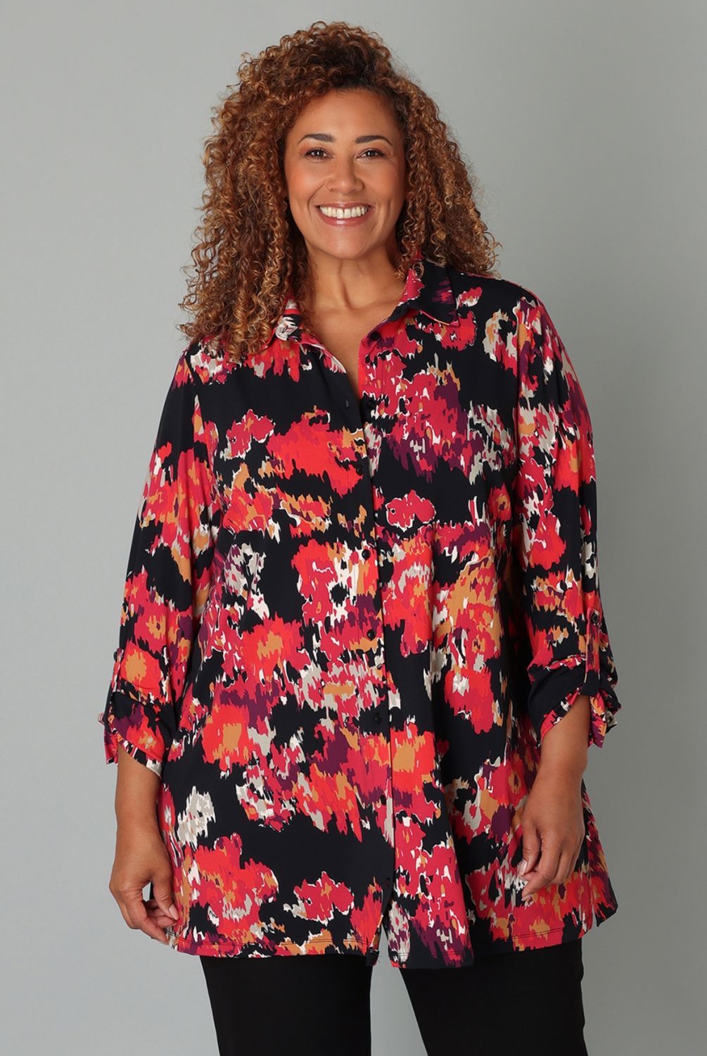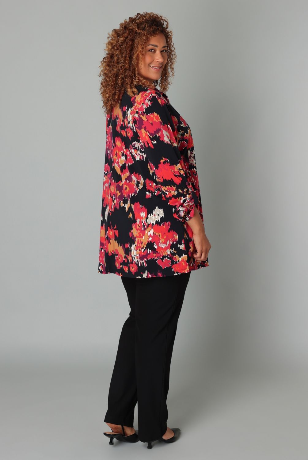 Deze jersey blouse heeft een levendige rode print die je look laat stralen. De soepele stof draagt prettig, terwijl de ophaallus in de mouw zorgt voor een speels detail. Ideaal met een zwarte broek, maar net zo leuk met denim.