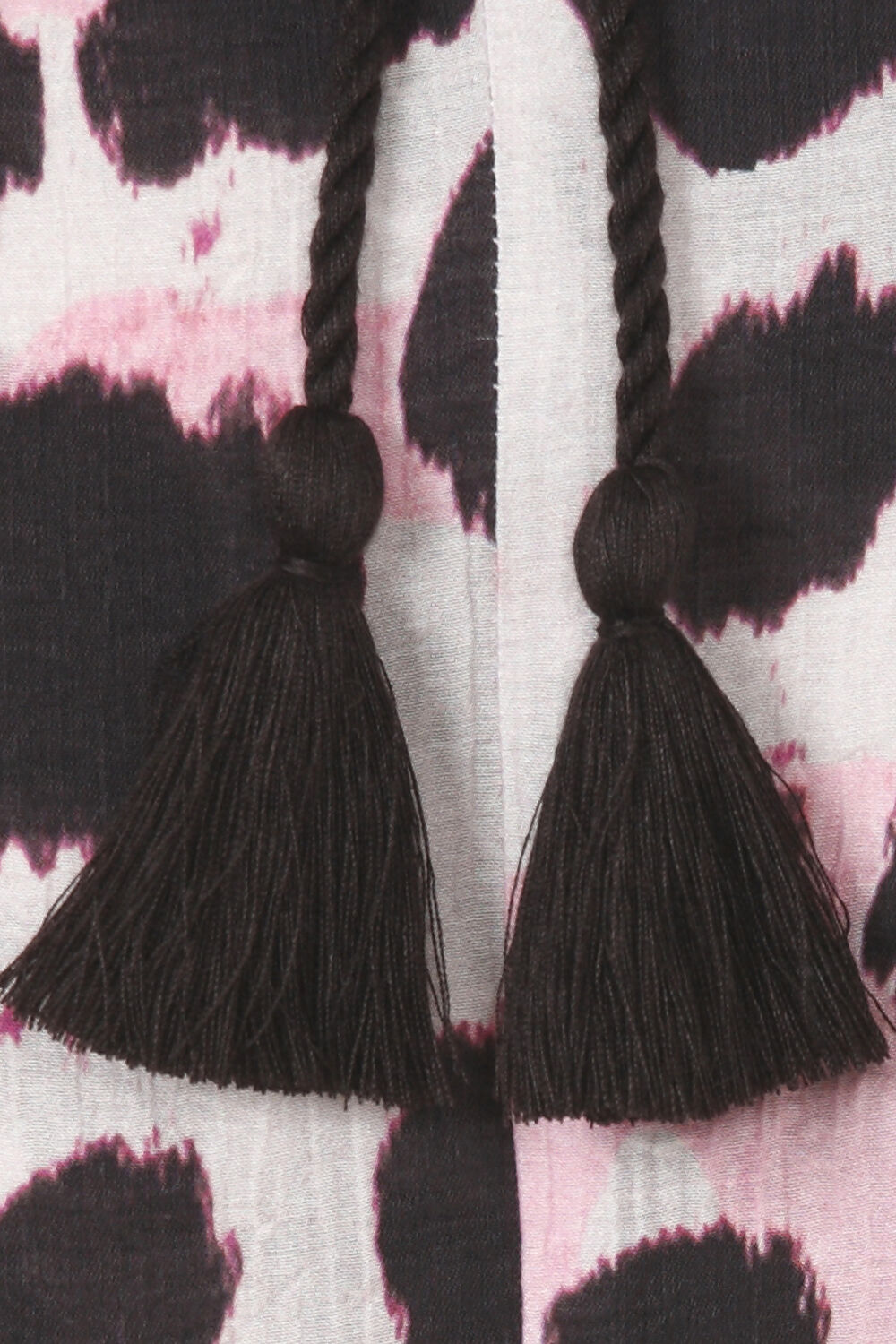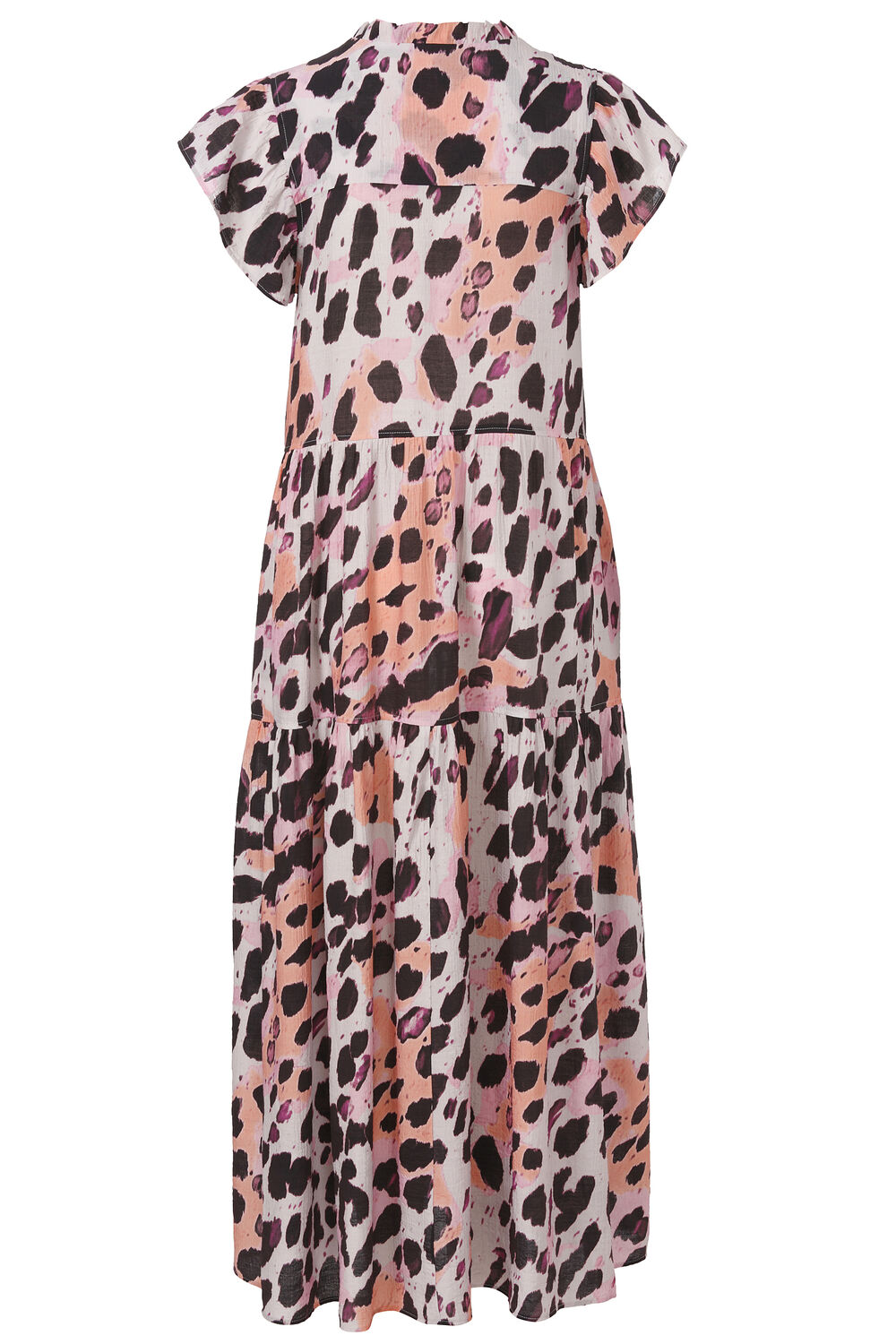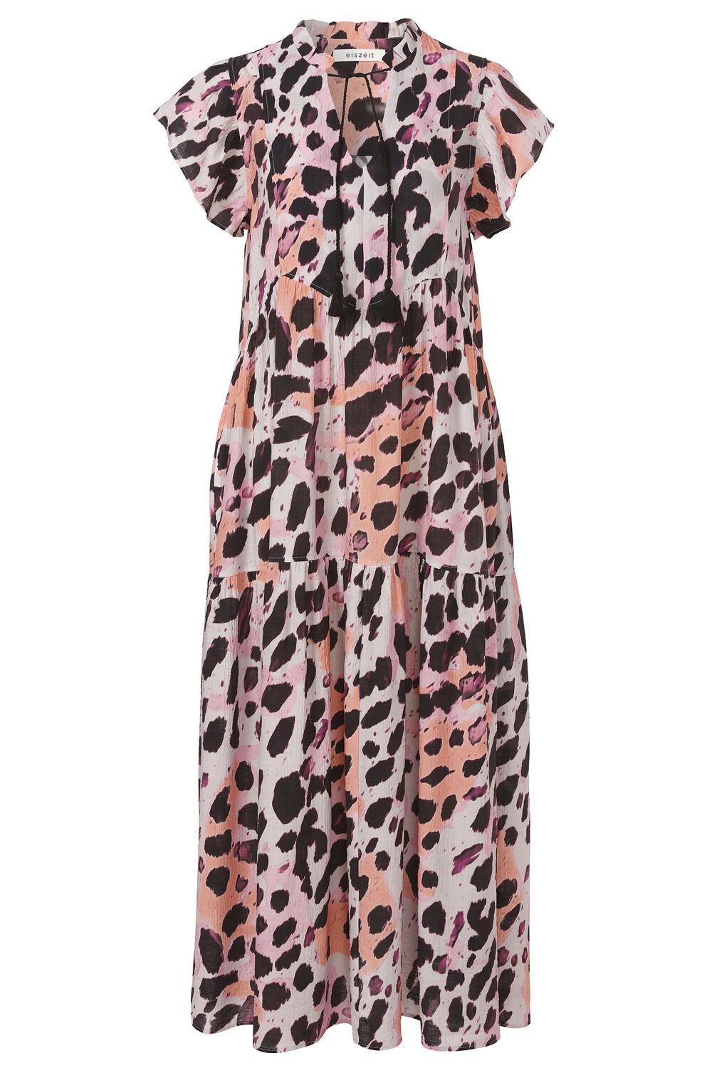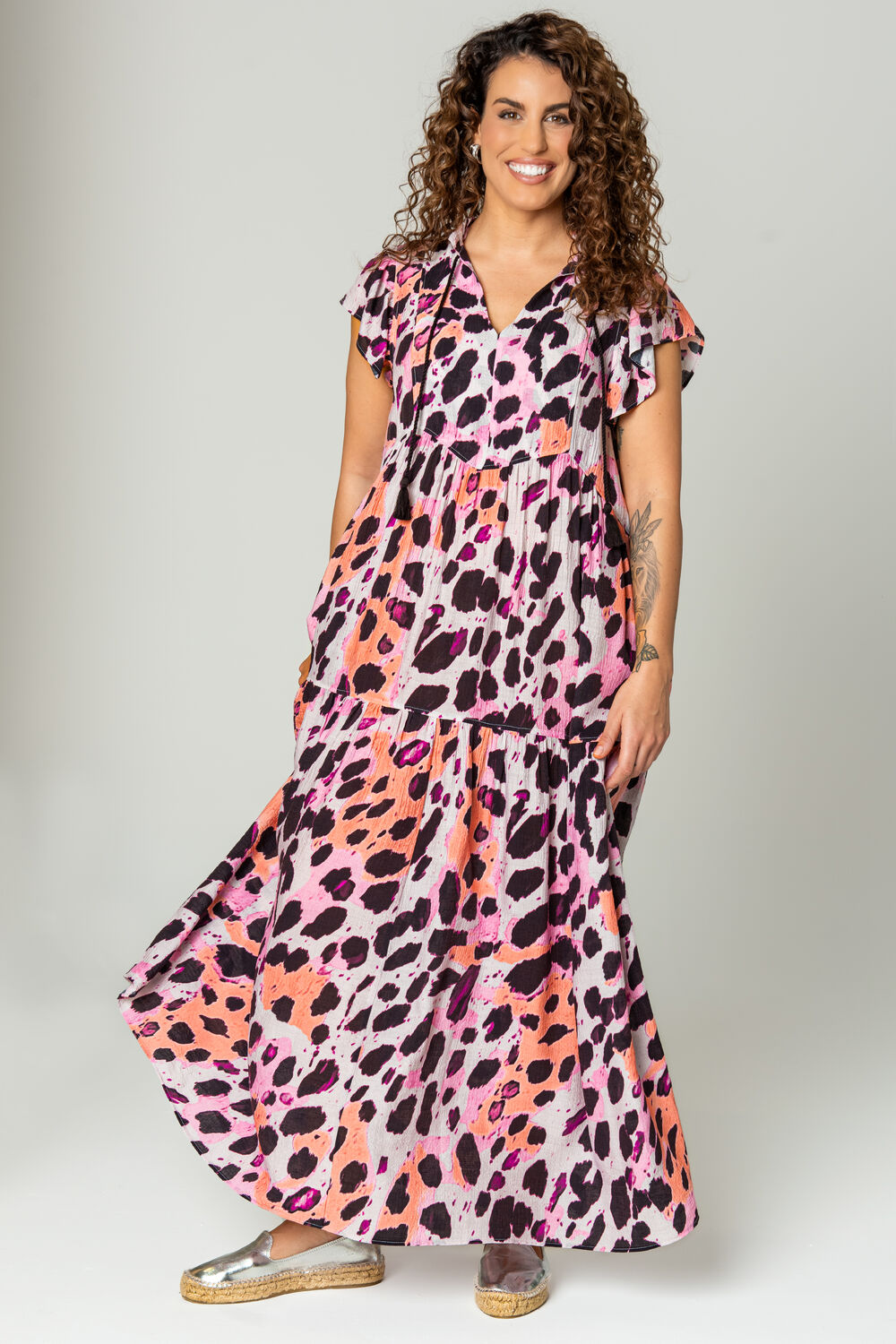Lange wijduitlopende ruche jurk met klein ruche mouwtje en openvallende ronde kraag met koordje.