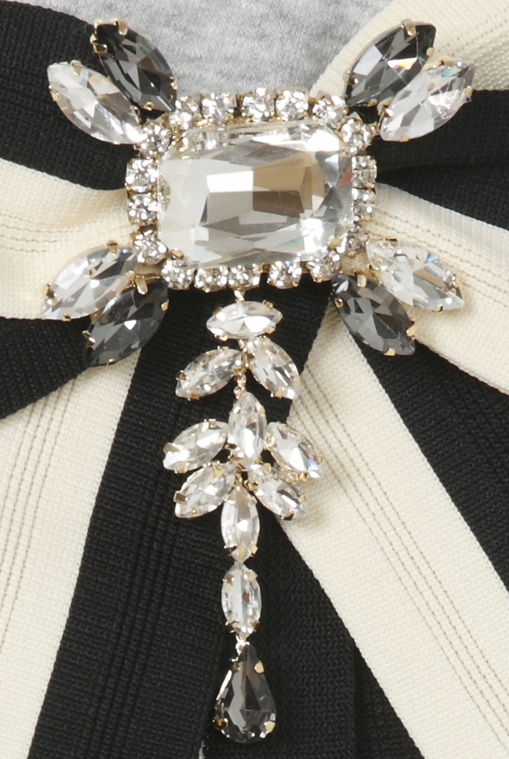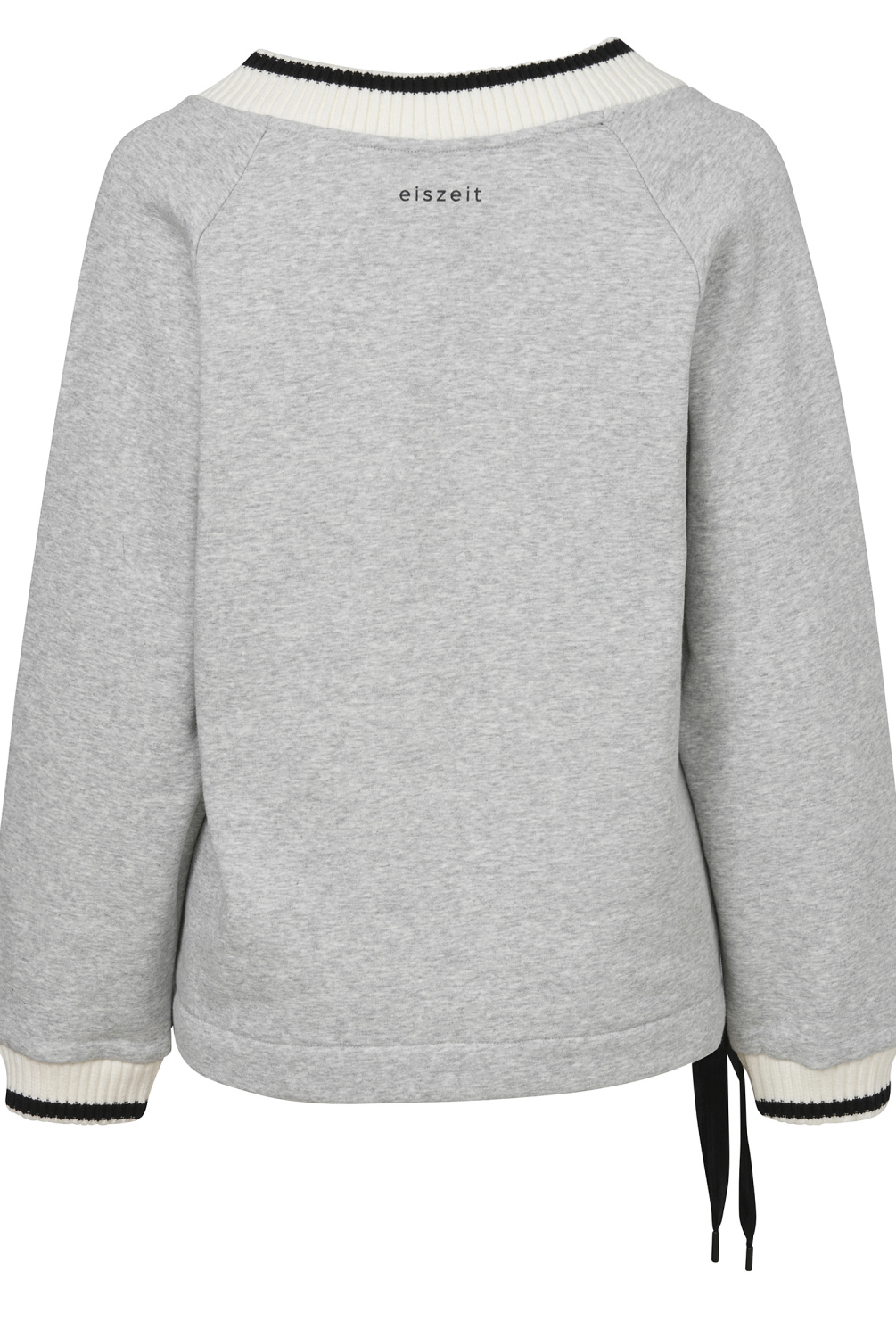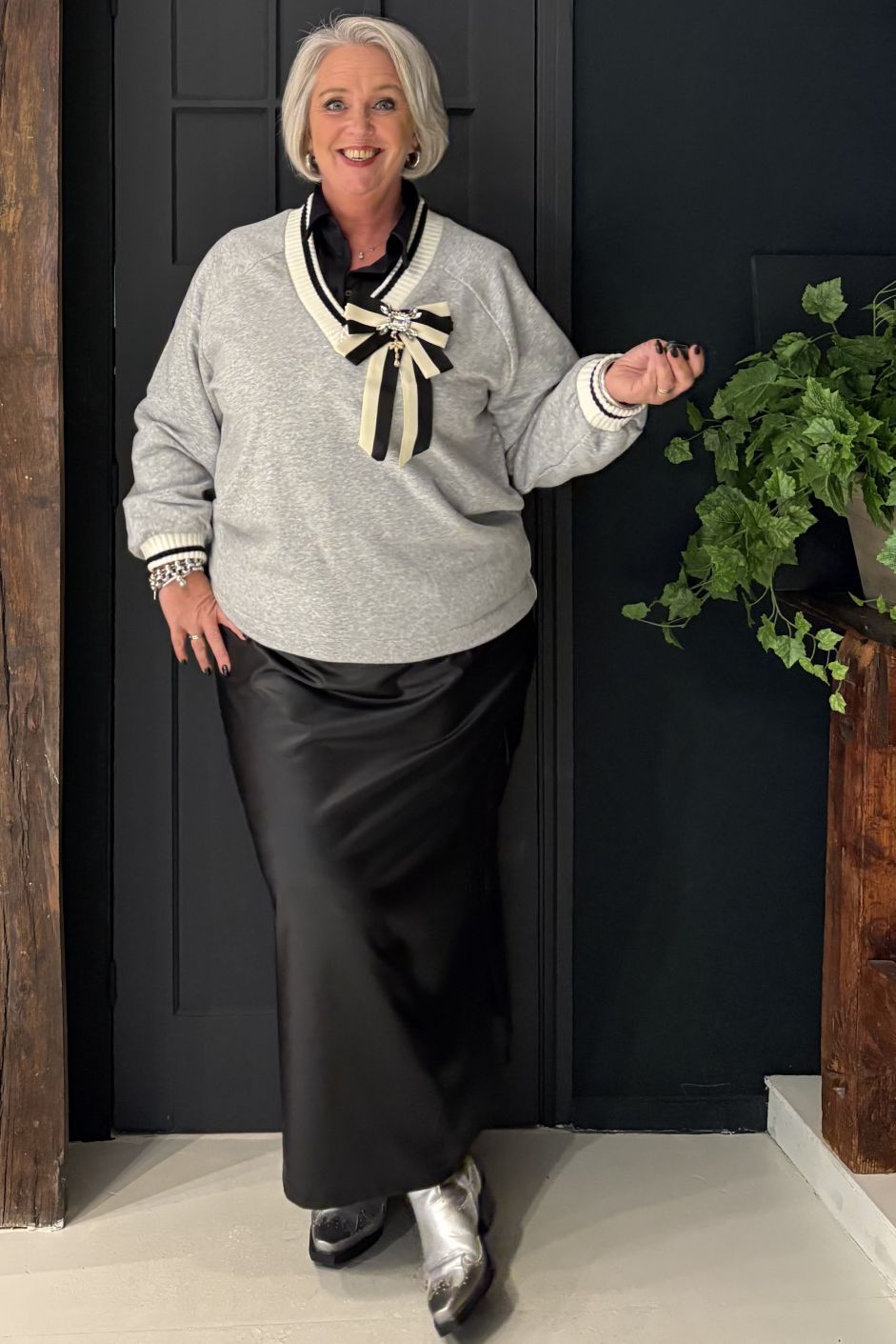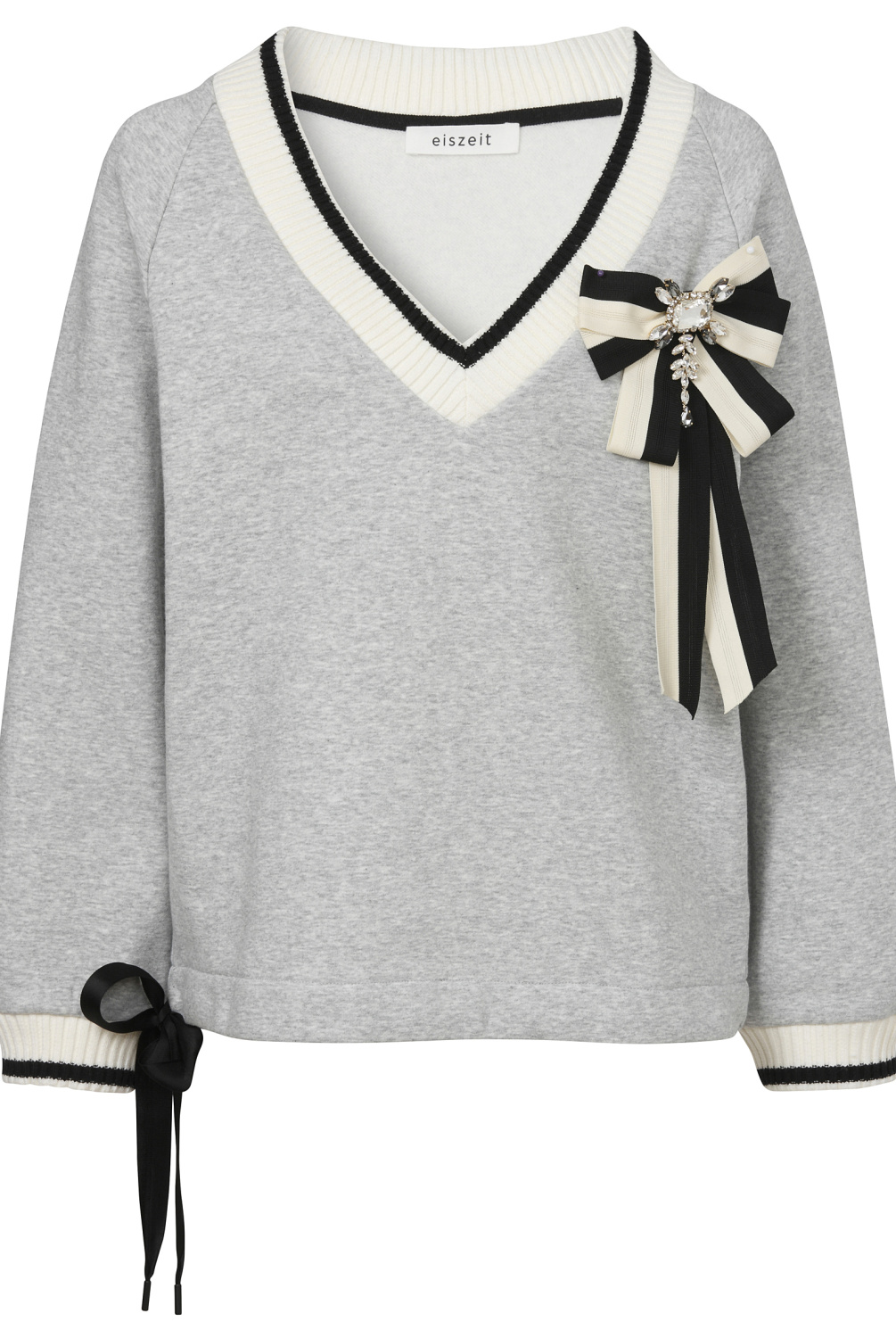 Sweatshirt met V-hals en pofmouwen. Onderzijde kan je eventueel aansnoeren voor een pof effect. De broche is afneembaar.