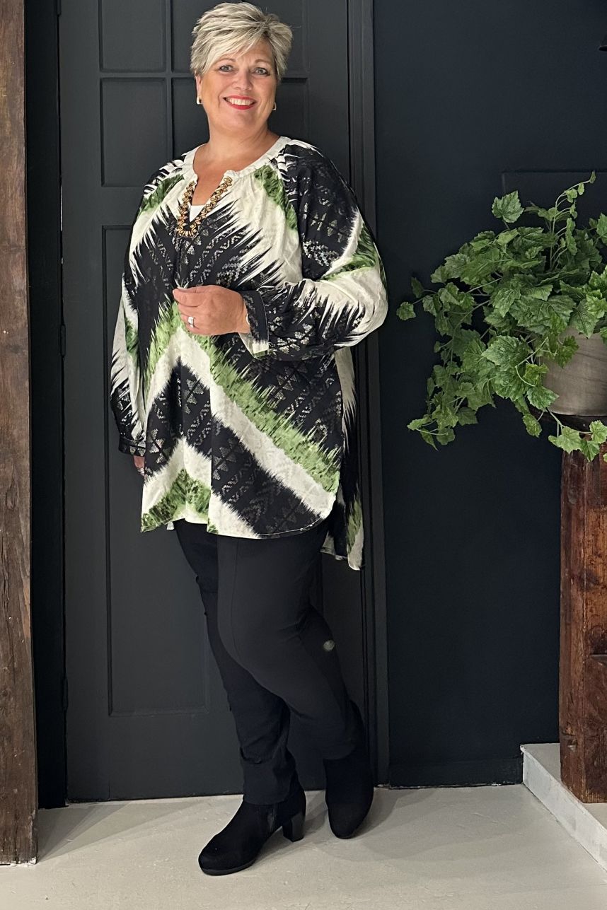 Deze tuniek is ontworpen om een statement te maken en toont een opvallende verenprint in opvallend groen, wit en zwart, wat een betoverend spel van contrast en beweging creëert. De verfraaide V-halslijn voegt een vleugje verfijnde elegantie toe en trekt de aandacht met ingewikkelde details. Lange mouwen zorgen voor een sierlijk, vloeiend silhouet en balanceren de dynamische print met een gevoel van verfijning. Doordrenkt met zelfvertrouwen en individualiteit, is dit stuk een viering van onverschrokken stijl, perfect voor degenen die gedurfde patronen en expressieve mode omarmen.