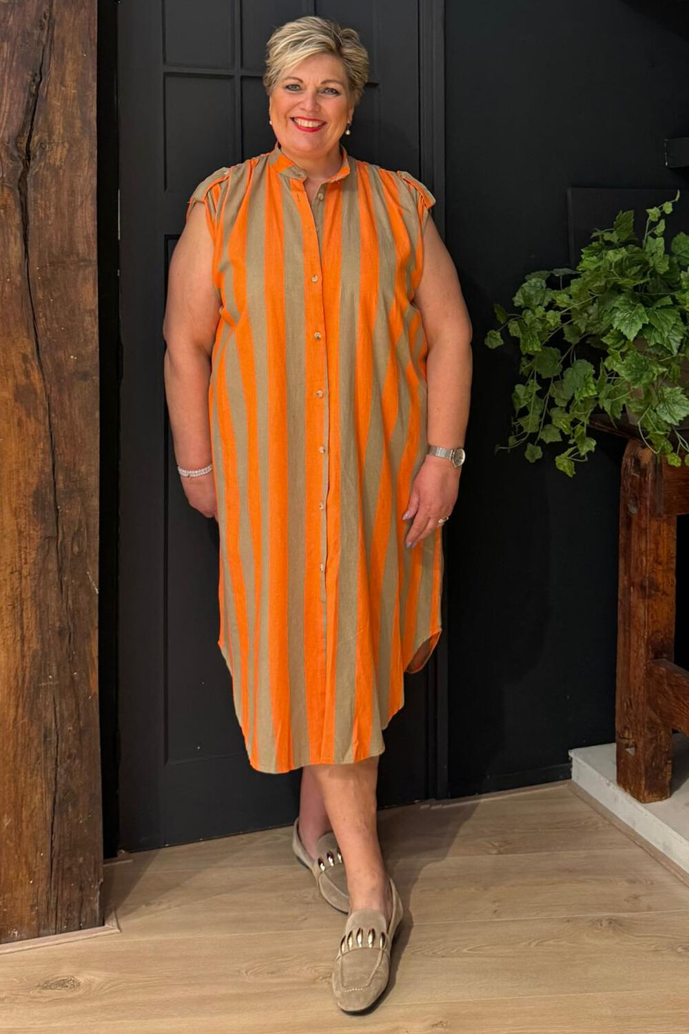 Mouwloze katoenen blousejurk, gemaakt in Italie, met beige en oranje verticale strepen en een knoopsluiting. Bevat een katoenen riem.
