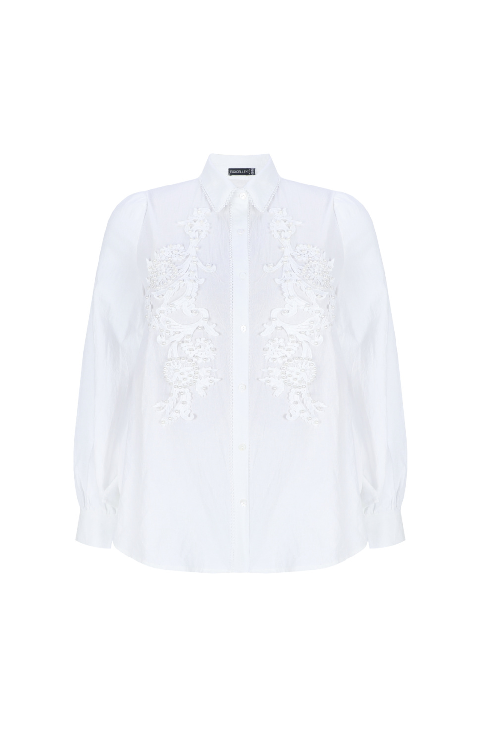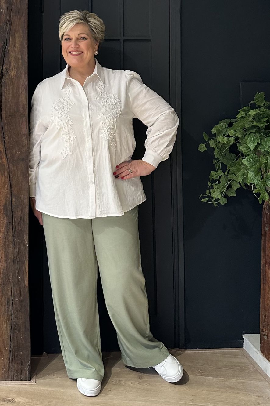 Tijdloze elegantie met een vleugje luxe. De Lotte blouse straalt verfijning uit dankzij het subtiele borduurwerk met pareldetails aan de voorzijde. De licht transparante stof en de klassieke kraag geven het item een vrouwelijke, stijlvolle uitstraling. Perfect voor een chique look, zowel casual als gekleed te dragen. Dit item valt normaal. Kies jouw normale maat.