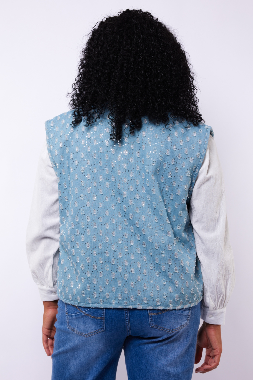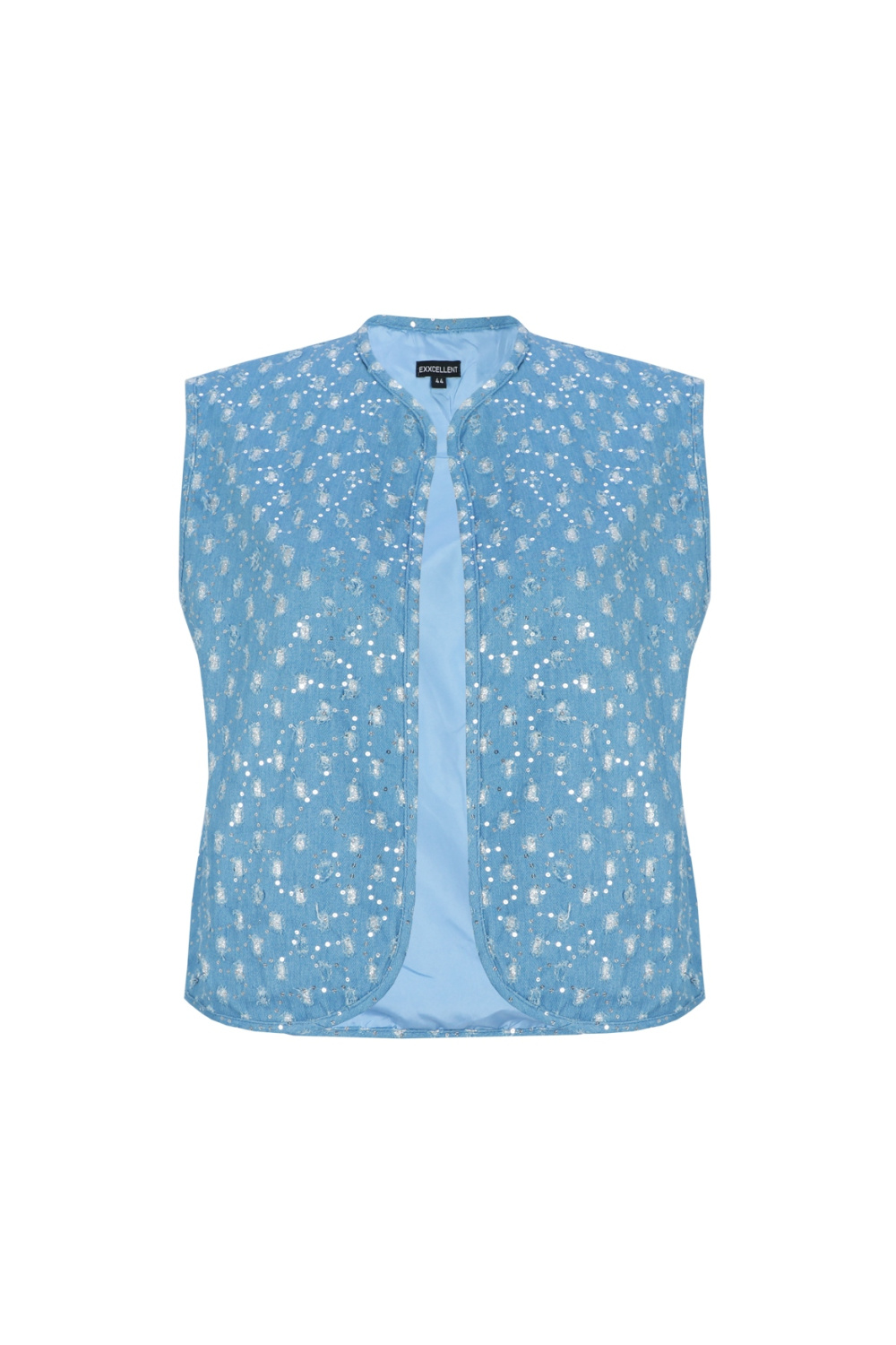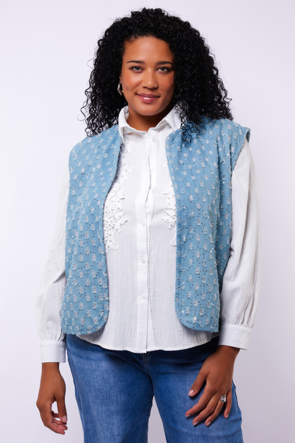Een speelse glans met een vleugje denim. De Isa gilet is een mouwloos model met een lichtblauwe denimlook, versierd met pailletten die het item een feestelijke uitstraling geven. Draag hem over een blouse of coltrui voor een trendy laagjeslook met subtiele sparkle. Dit item valt normaal. Kies jouw normale maat.