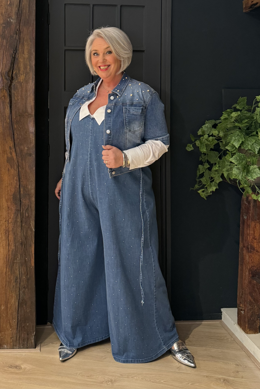 Een statement denim piece met een vrouwelijke en eigentijdse uitstraling. De Isodora jacket heeft een licht aansluitende pasvorm, een klassieke kraag en een knoopsluiting, uitgevoerd in een comfortabele stretchdenim die prettig draagt. De verfijnde parel- en steendetails op de schouders geven het jasje een subtiele sparkle en een unieke, luxe touch.