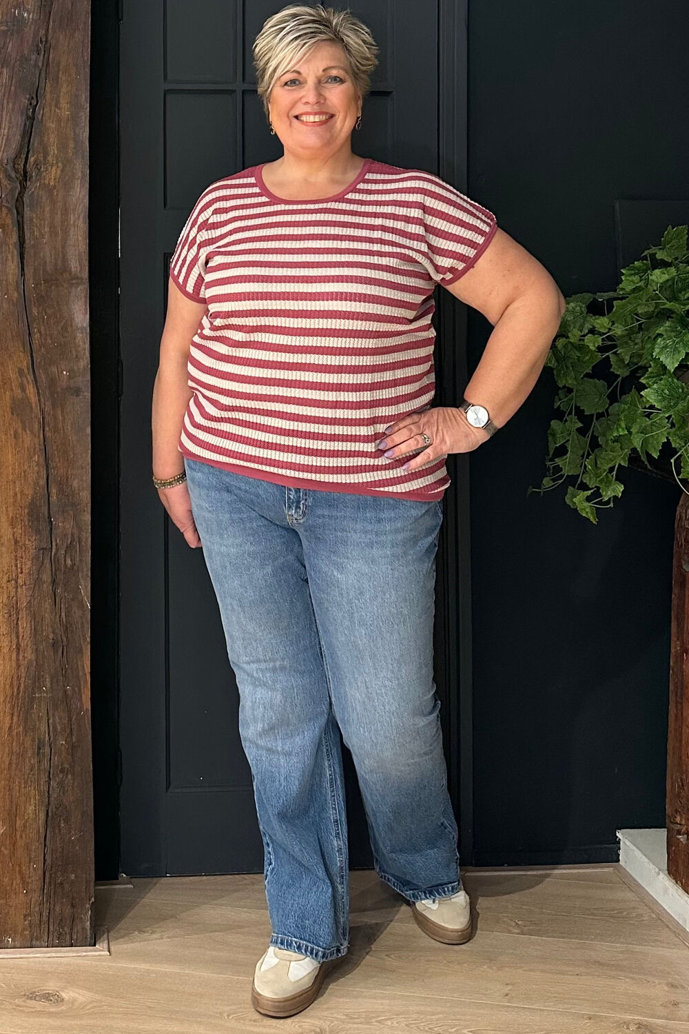 Een speelse knit met een vrouwelijke twist. De Leighton gebreide top is uitgevoerd in een luchtige structuur met horizontale strepen, wat zorgt voor een frisse en moderne uitstraling. De korte mouwen met omslag en de ronde hals geven het model een ontspannen fit, terwijl het subtiele kruisdetail op de rug zorgt voor een verrassend accent. Perfect te combineren met een bijpassende broek of juist op een jeans voor een casual chic look. Een geliefd item binnen onze collectie, jouw Exxcellent Choice.