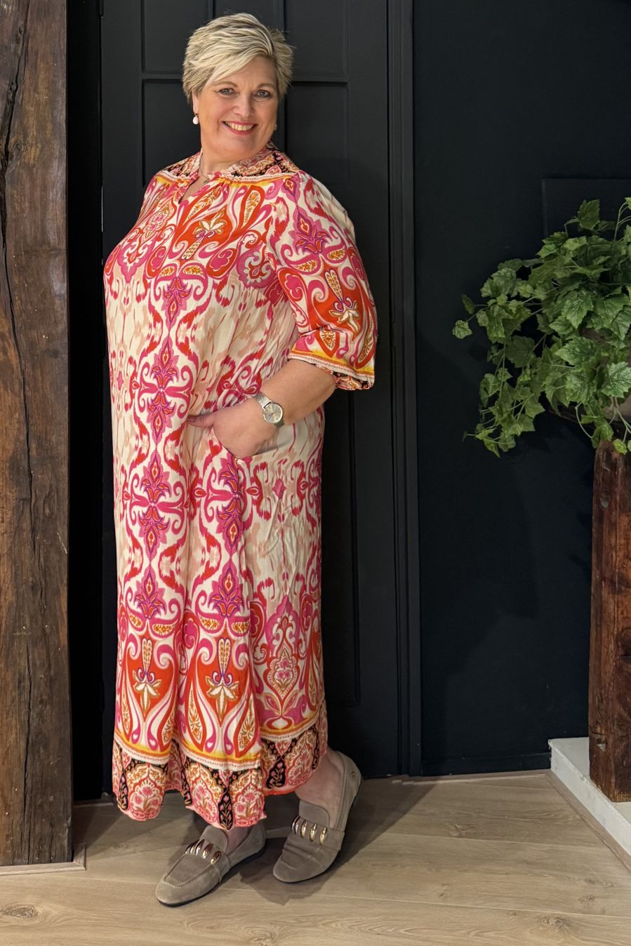 Een vrouwelijke jurk van 100% viscose, die een lichte en comfortabele kwaliteit combineert met een decoratieve print in warme tinten. Het ontwerp heeft een eenvoudige halslijn en lange mouwen, terwijl de losse pasvorm zorgt voor een mooie val en hoog draagcomfort – geschikt voor zowel dagelijks gebruik als meer ontspannen gelegenheden.