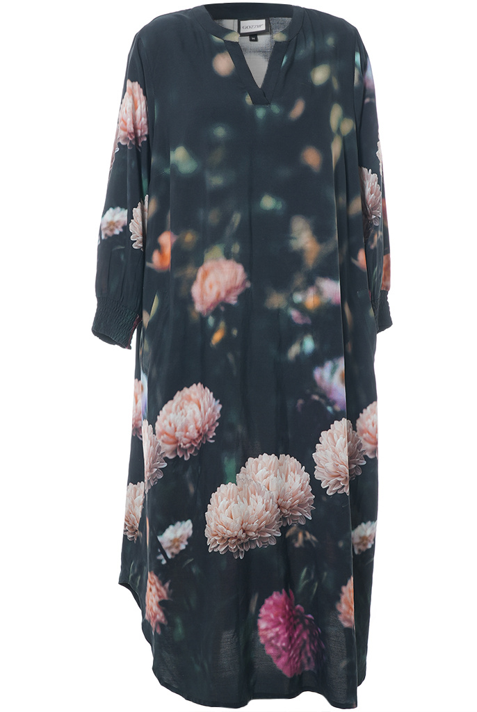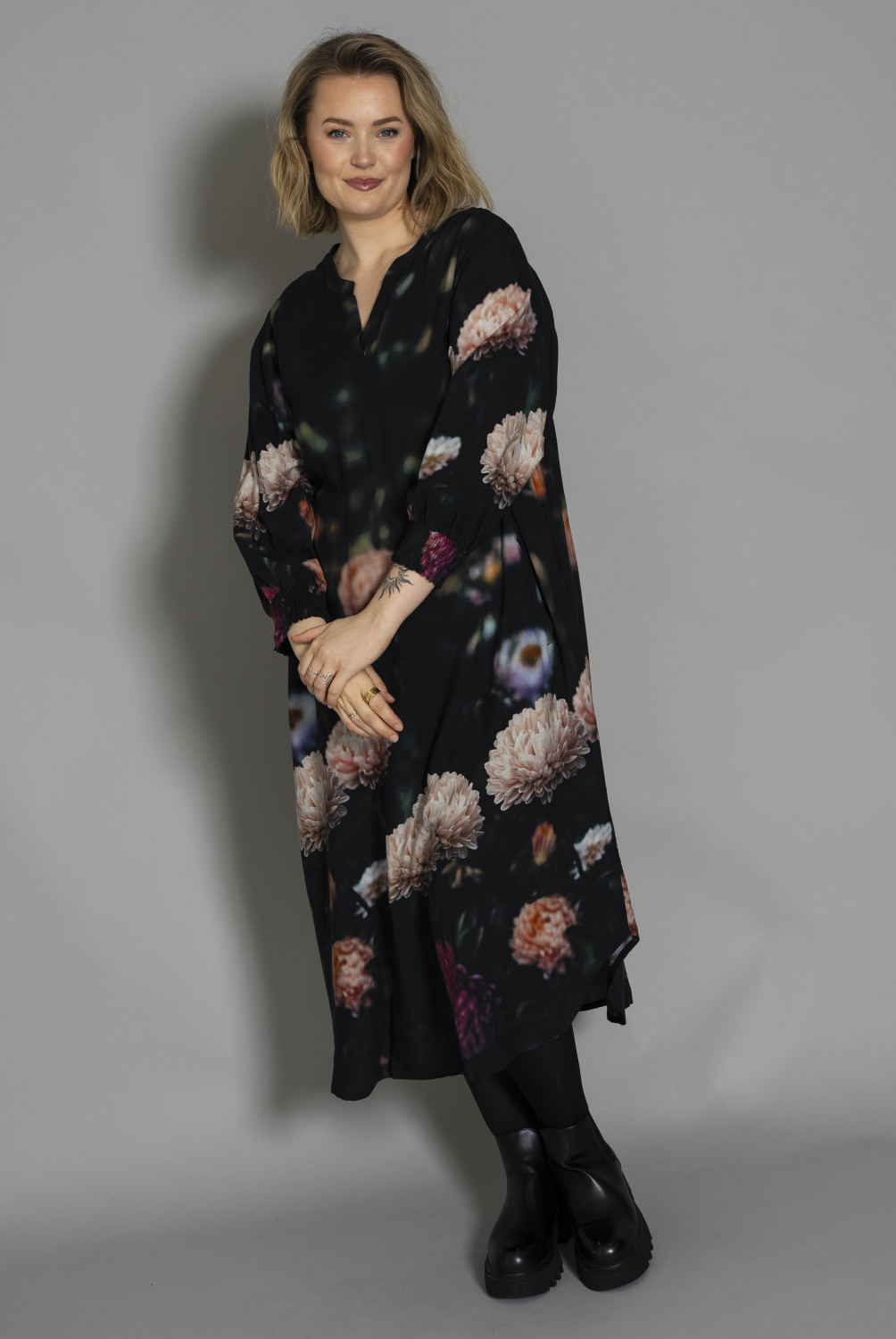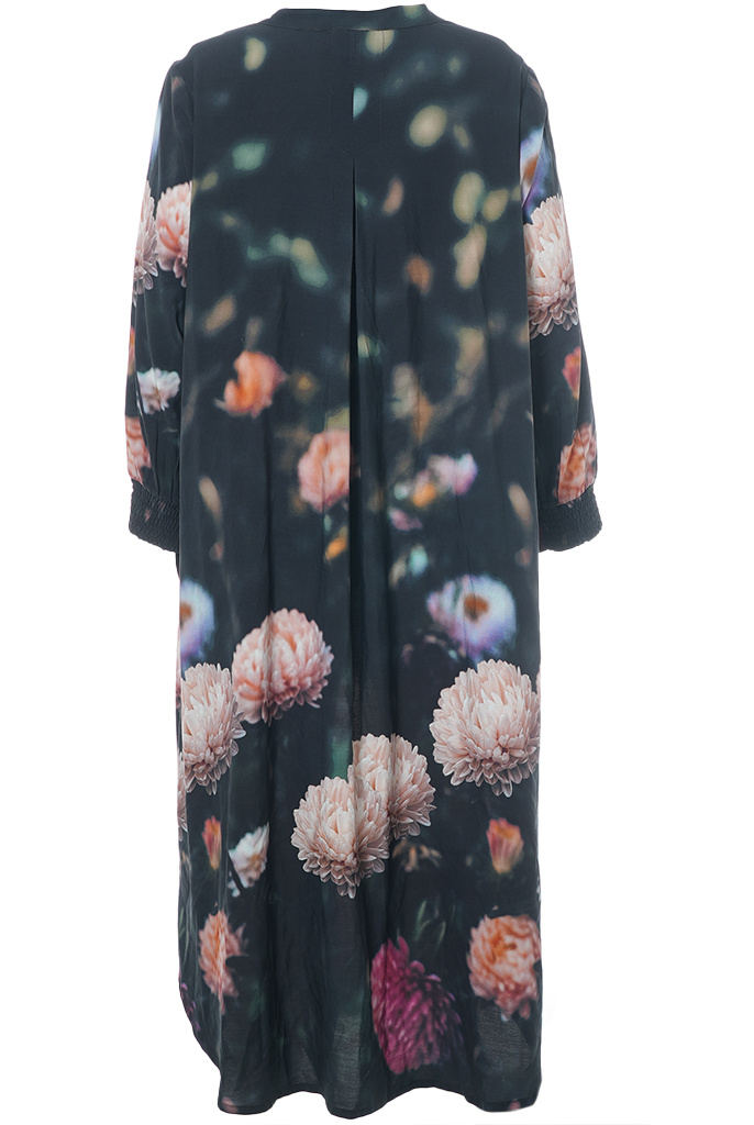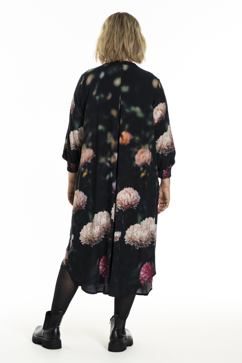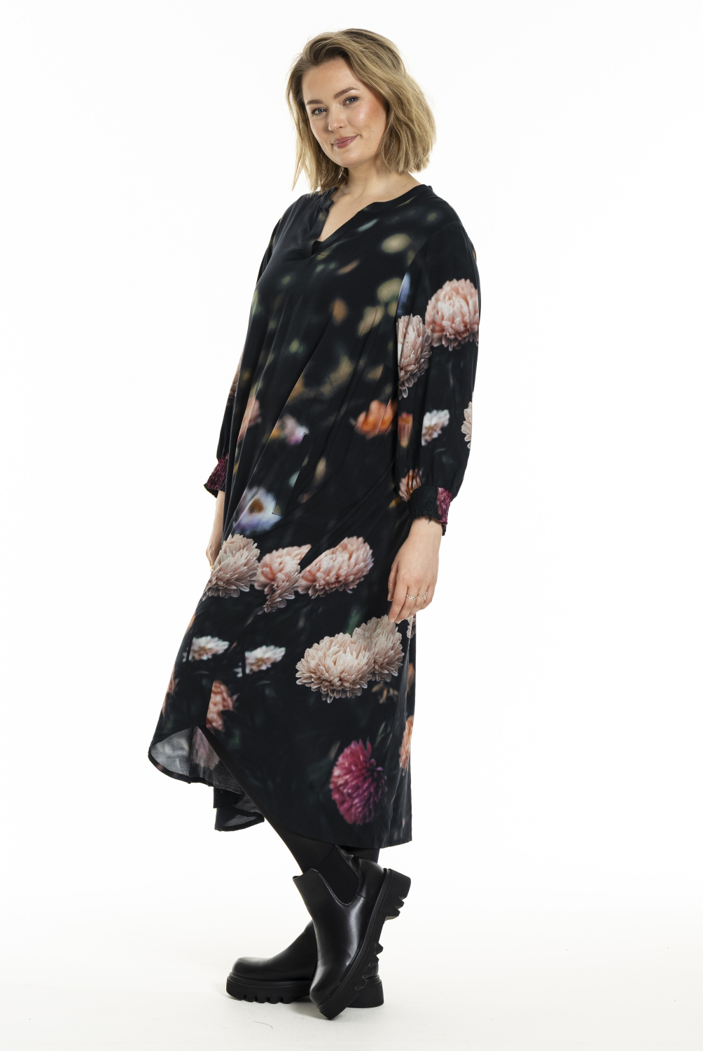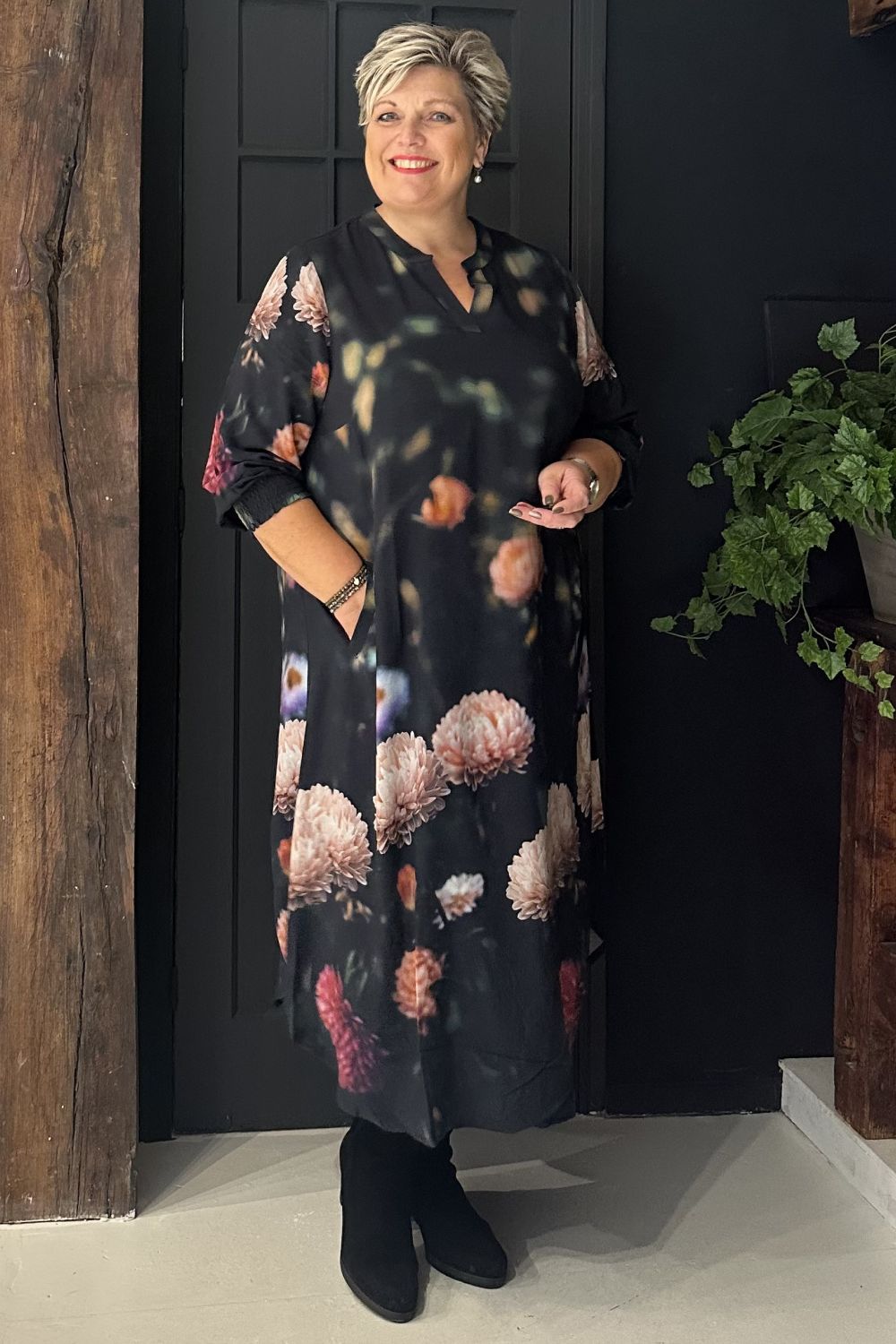 Een jurk van 100% viscose met een vrouwelijke pioenroosprint in lichte tinten. Het model heeft een V-hals aan de voorkant en lange mouwen met manchetten, wat zorgt voor een elegante en tijdloze look. De losse pasvorm zorgt voor comfort en maakt de jurk veelzijdig, zowel voor dagelijks gebruik als voor feestelijke gelegenheden.