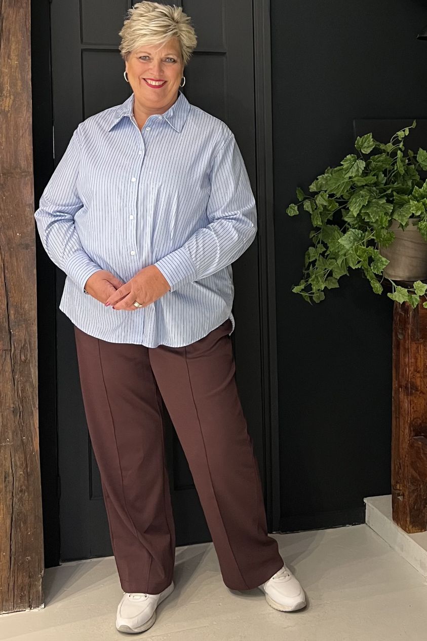 Dames broek met rechte pijpen en comfortabele pasvorm. Elastische tailleband met koord en middenhoge taille zorgen voor veelzijdigheid en gemak. Voorzien van subtiele naad aan de voorkant.