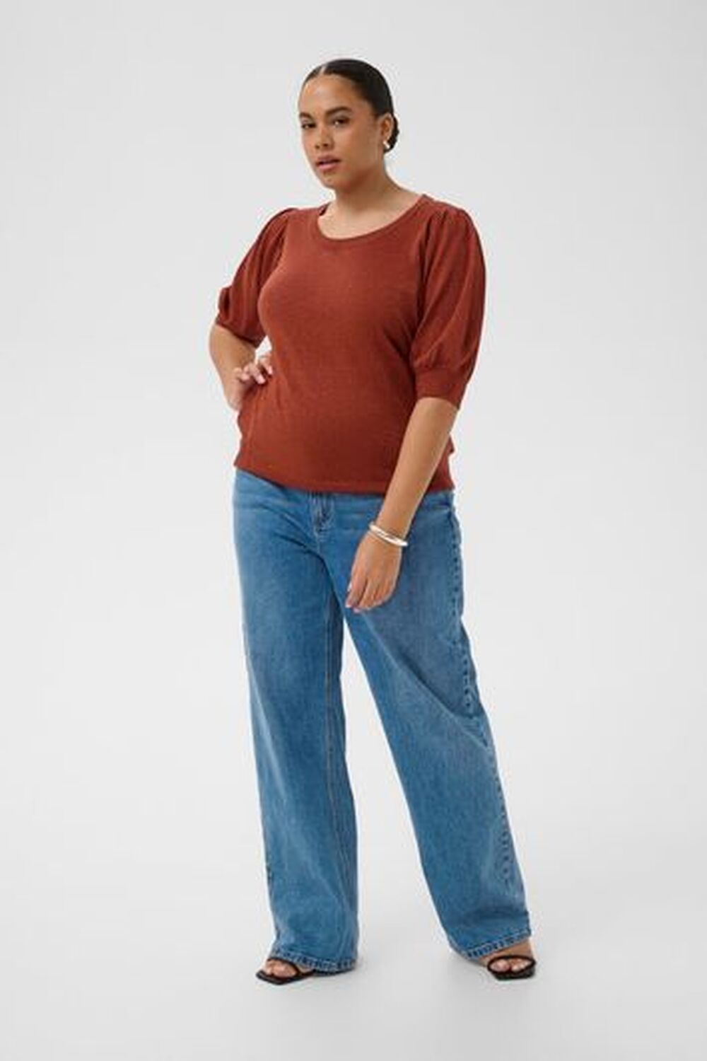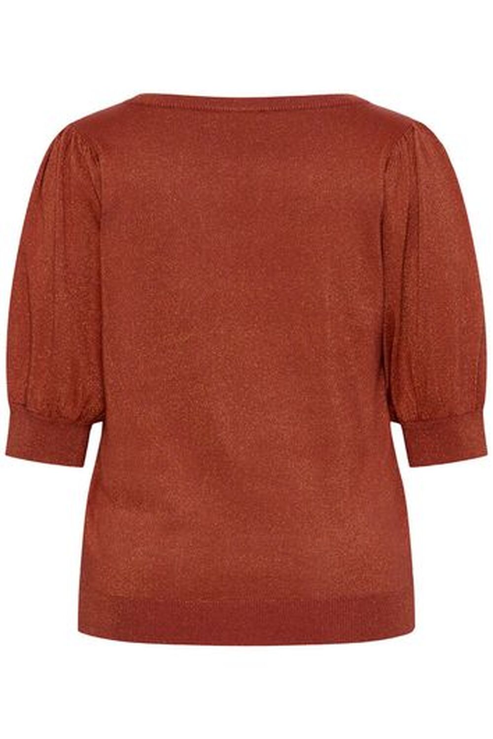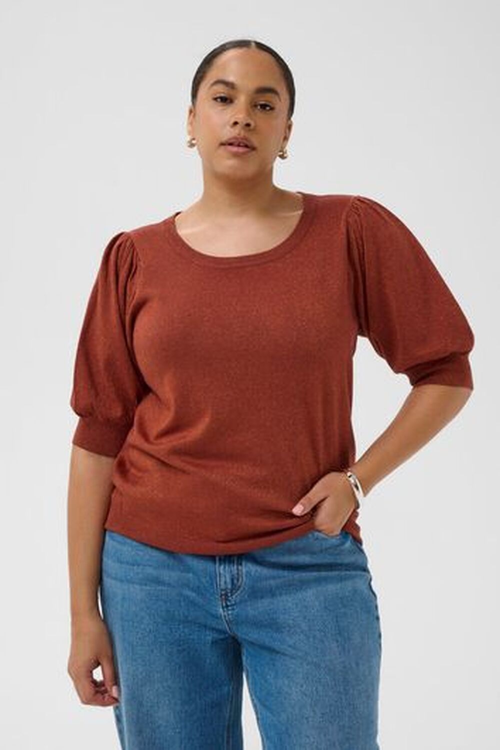 Deze comfortabele gebreide trui met ronde hals, relaxte pasvorm en halve pofmouwen is ideaal voor lagenlooks en dagelijks gebruik.