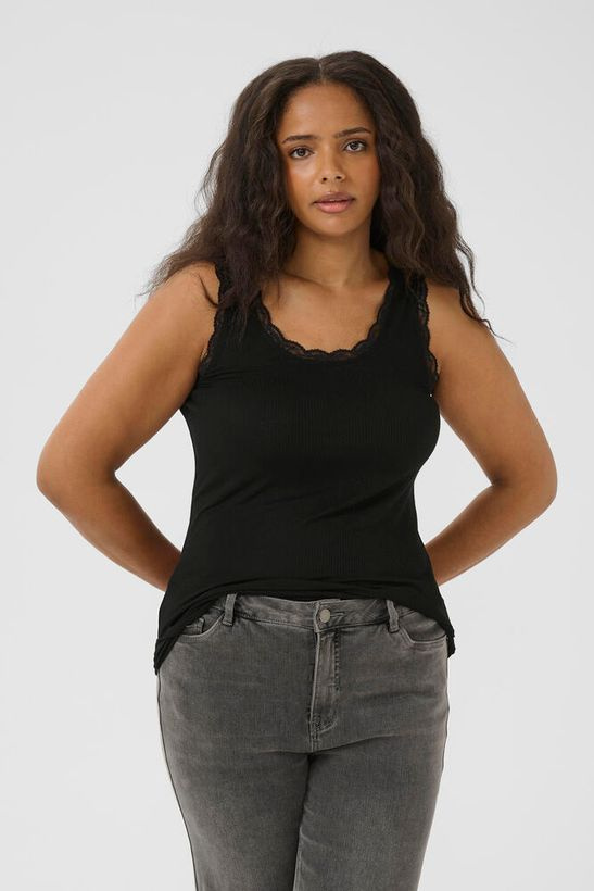 Zachte, geribde tanktop met aansluitende pasvorm en vrouwelijke kanten afwerking langs de hals en schouders. Ideaal om los te dragen of als laagje onder andere kleding.