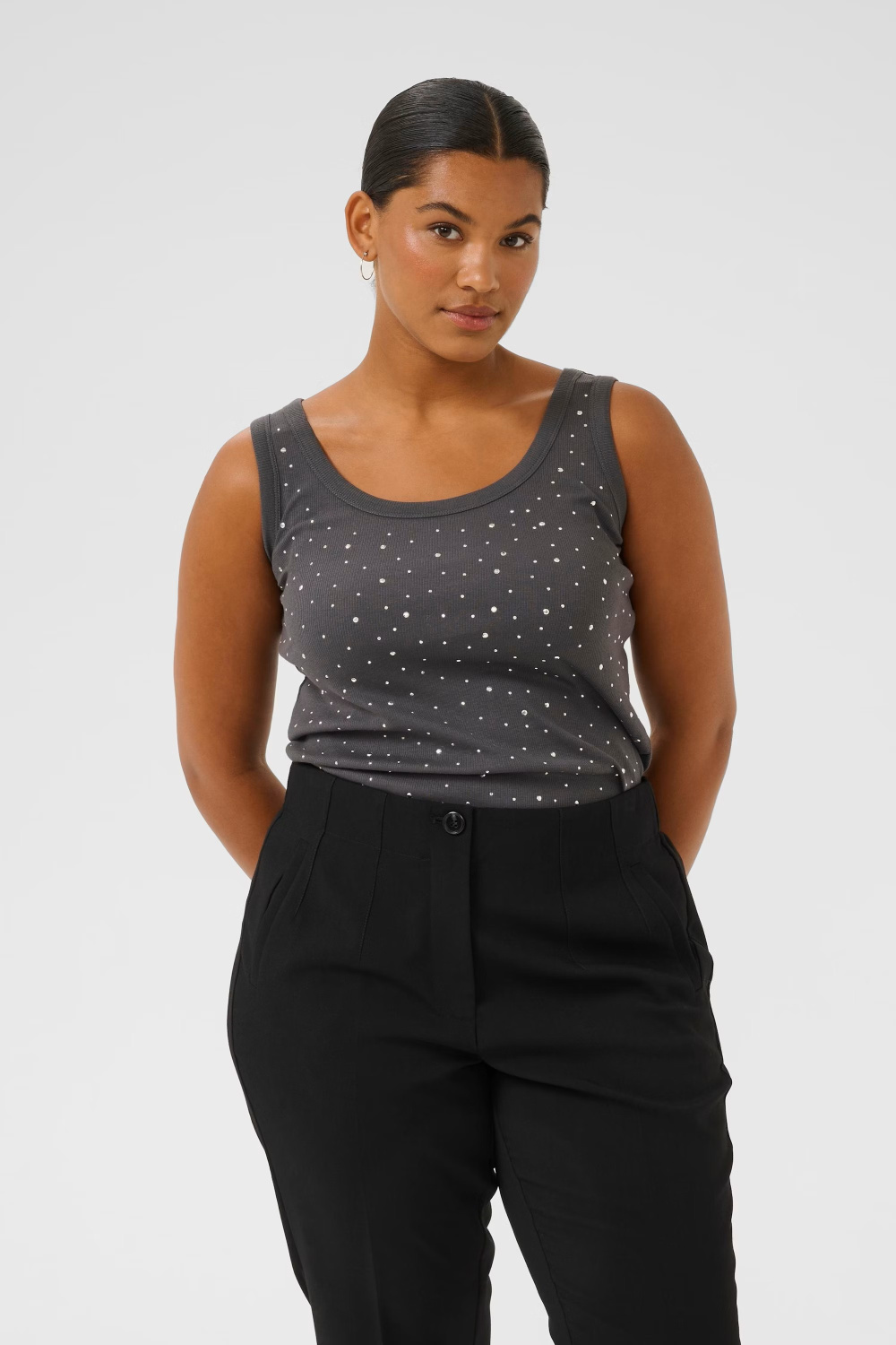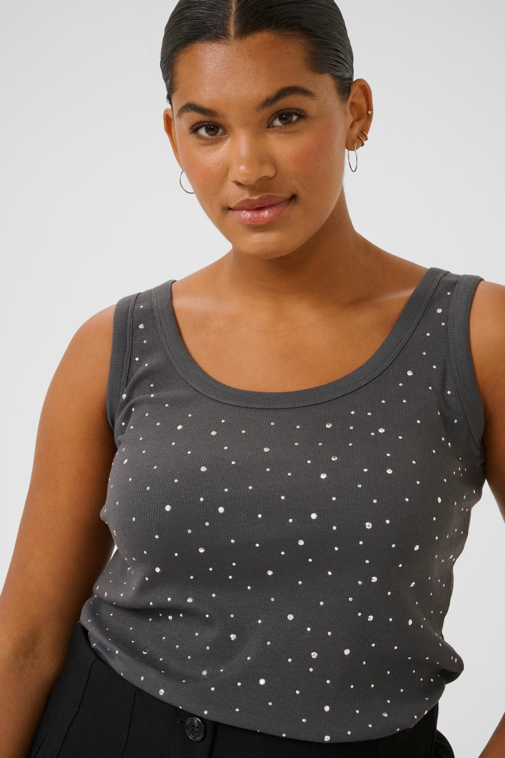 Dit damestopje heeft een klassieke pasvorm, glinsterende accenten, ronde hals en mouwloos ontwerp voor optimaal comfort. Perfect te dragen als laagje of als losse top.